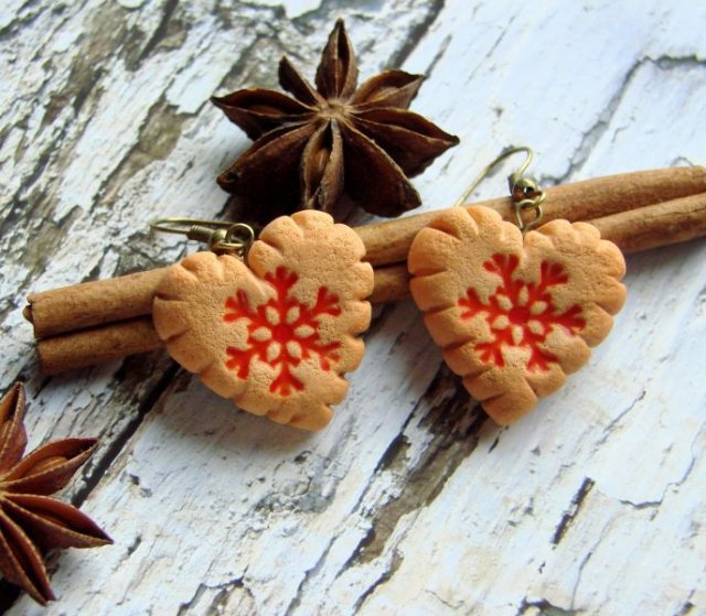 Kolczyki świąteczne ciastka w kształcie serca ze czerwoną śnieżynką wykonane ręcznie z fimo. Wielkość ciasteczka: 2,5 cm
