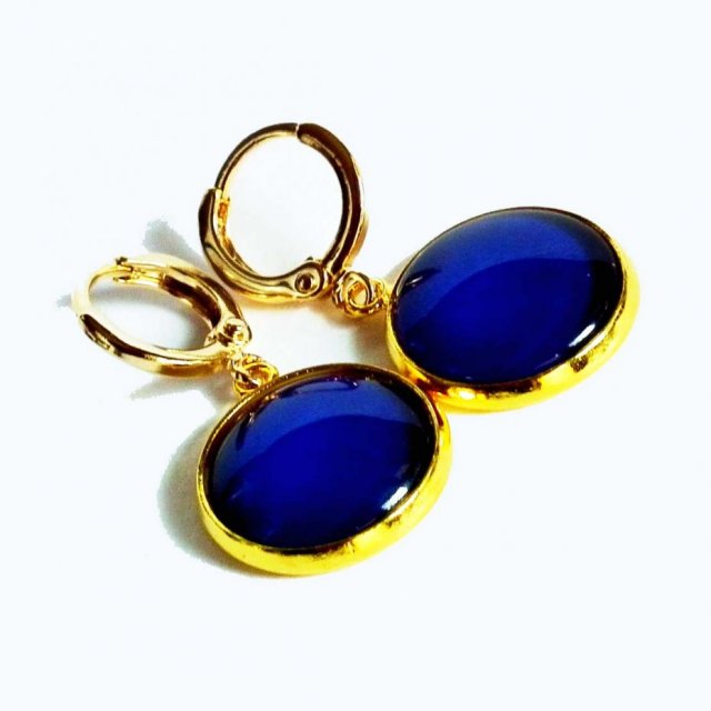 Subtelne, eleganckie kolczyki wiszące ze szkłem w oprawie w kolorze złotym. Wygodne bigle okrągłe, zapinane (tzw. bigle-kajdanki), pokryte 16K złotem. Bigle są hipoalergiczne. Grafika jest najwyższej jakości, wyraźna i nasycona. Wykonane z dbałością o każdy detal.