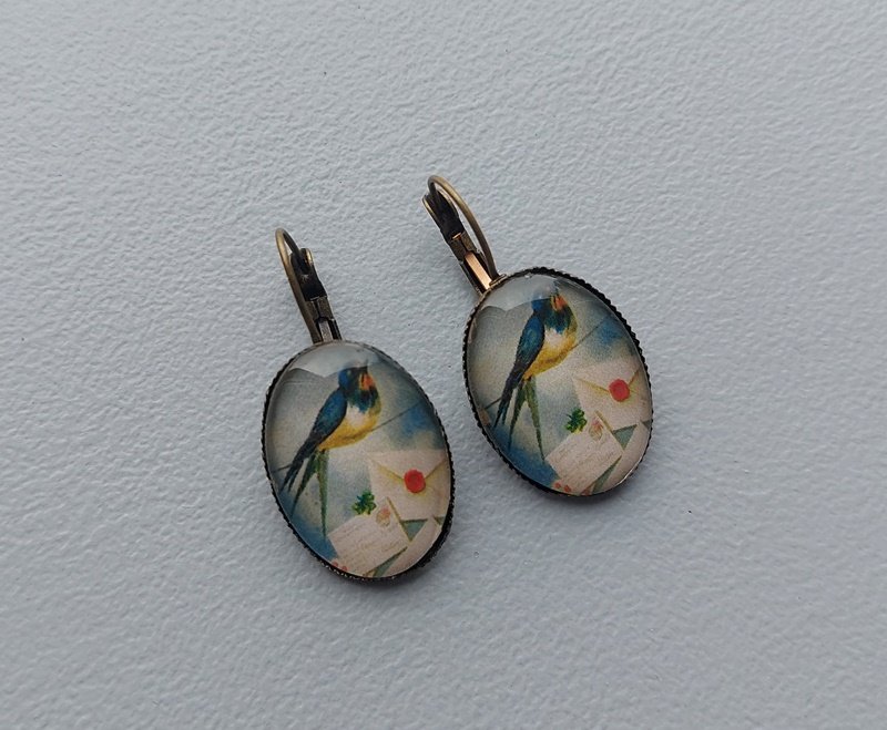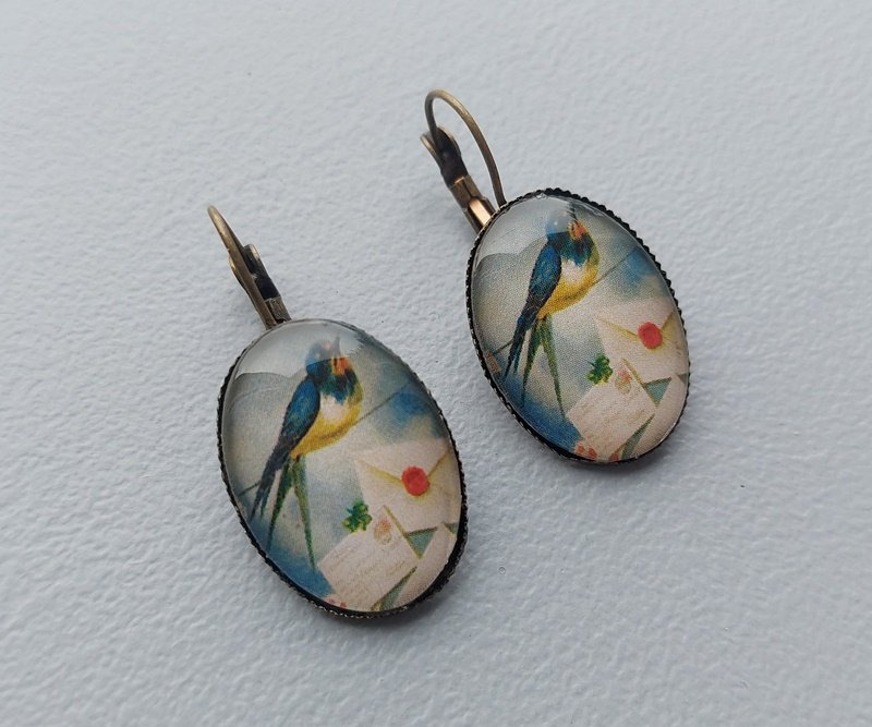 Kolczyki w stylu vintage ręcznie wykonane będą ciekawym akcentem stylizacji, przyciągną wzrok i wzbudzą zaciekawienie. Ta kolorowa grafika ukryta pod szklanym kaboszonem w oprawie w kolorze starego złota urozmaici nawet prosty outfit.
