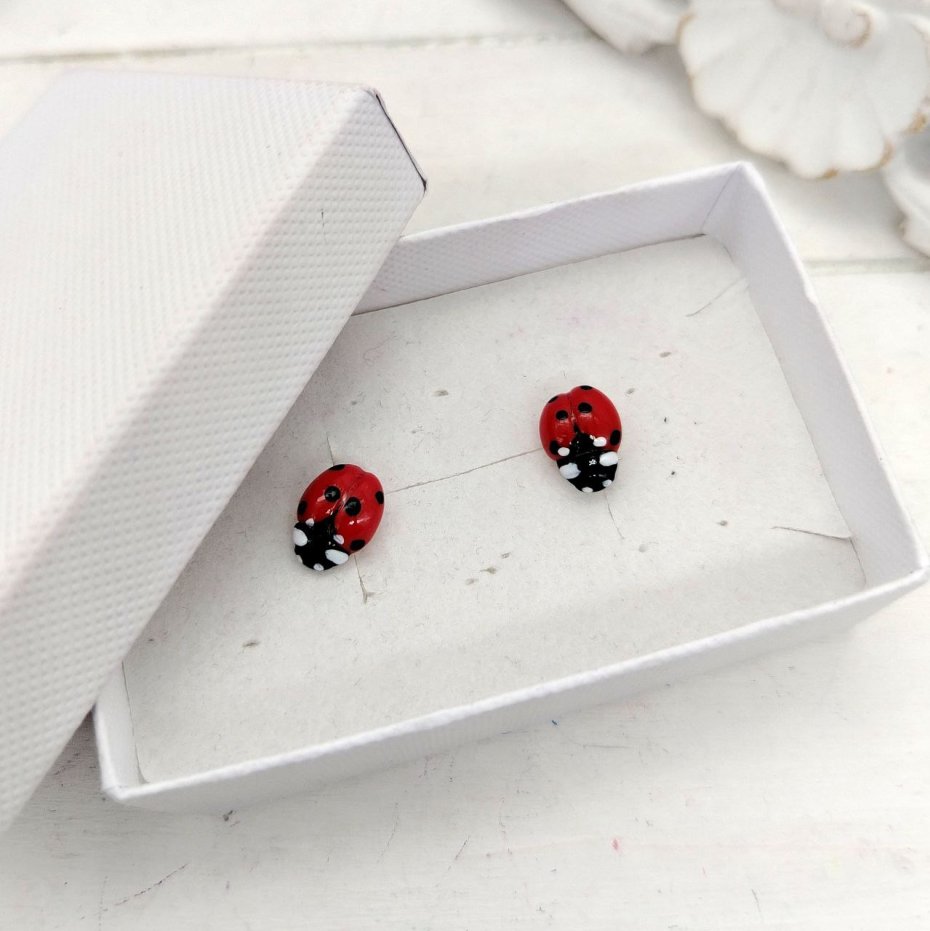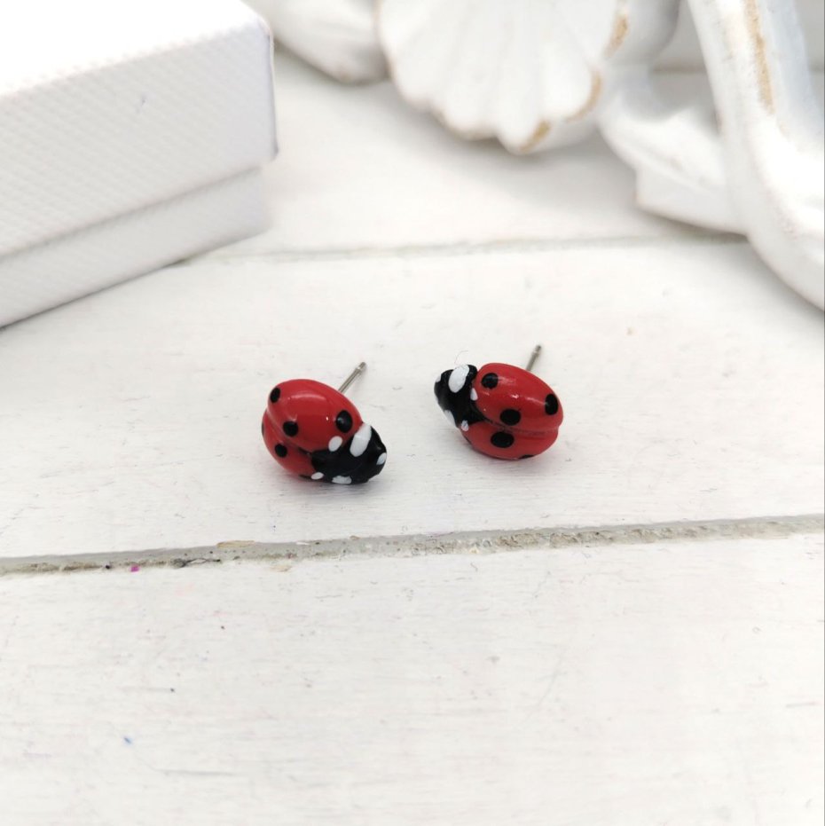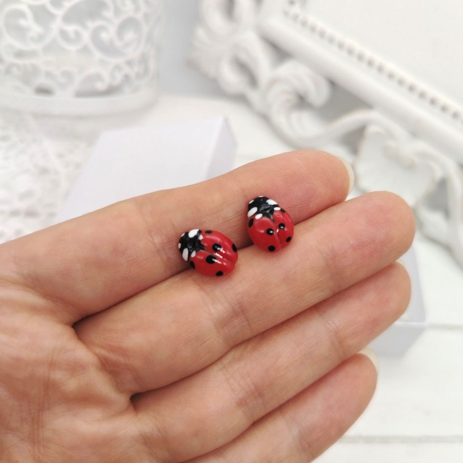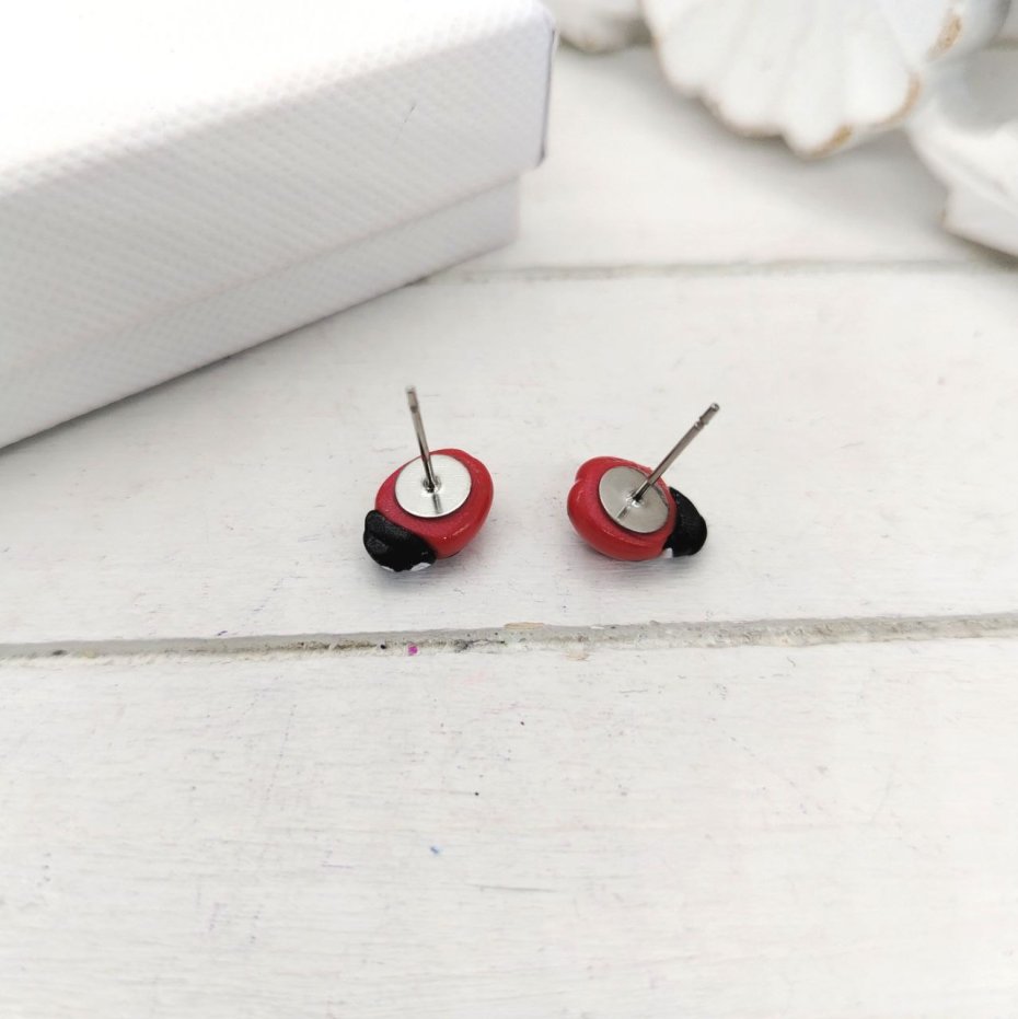 Te piękne, małe biedronki są ręcznie robione z wysokiej jakości gliny polimerowej. Sztyfty są ze stali nierdzewnej.