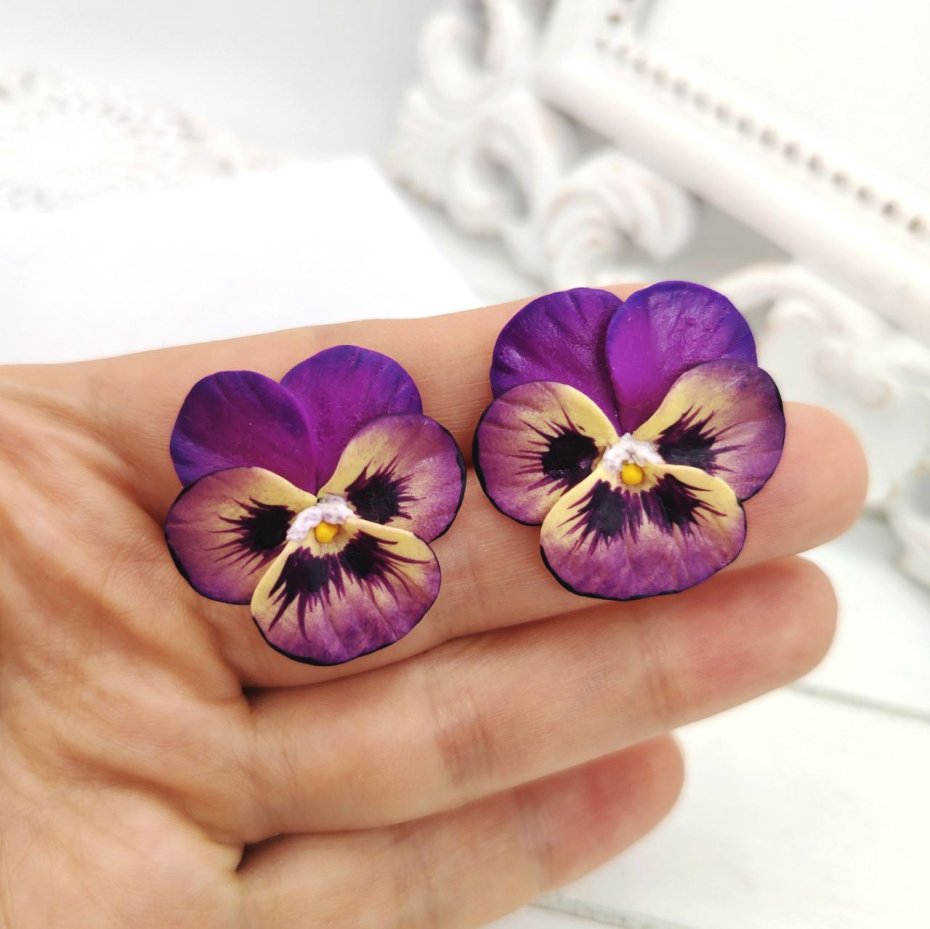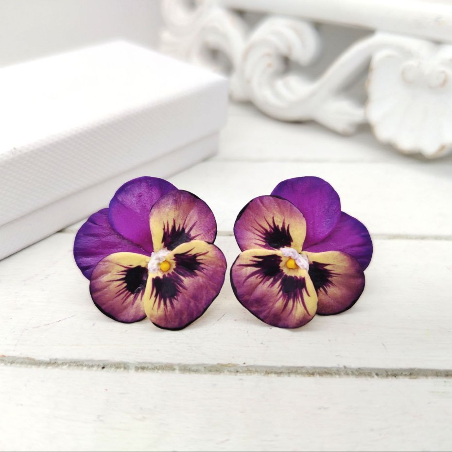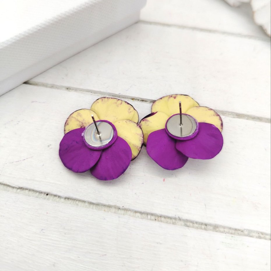 Kolczyki sztyfty w formie kwiatów bratków w odcieniach fioletowo-żółtych. Wykonane z gliny polimerowej, ręcznie malowane i pokryte wodoodpornym lakierem. F urnitura ze stali nierdzewnej gwarantuje trwałość oraz bezpieczeństwo noszenia.