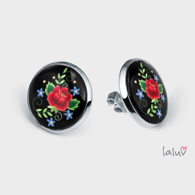 Ręcznie robione kolczyki z wysokiej jakości grafiką zamkniętą pod wypukłym szkiełkiem i oprawioną w antyalergiczną bazę w kolorze srebrnym. Każda para zaopatrzona jest w zatyczki w kolorze bazy zapobiegające wypadaniu kolczyków z uszu. ;)