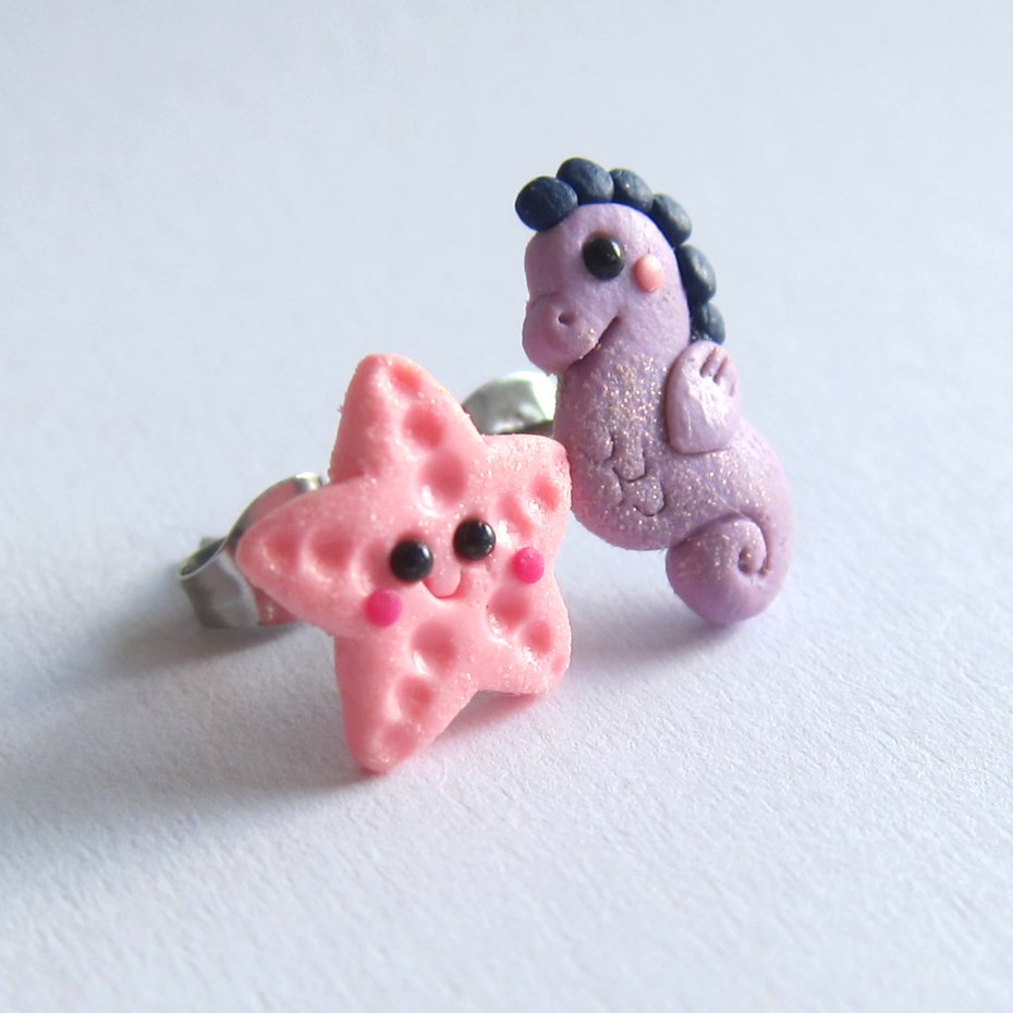 Zabawne kolorowe kolczyki wykonane ręcznie z masy termoutwardzalnej Fimo w kształcie konika morskiego i rozgwiazdy. Wielkość kolczyków to ok. 16 mm x 9 mm (konik morski) 13 mm (rozgwiazdy). Sztyfty wykonane są ze stali chirurgicznej. Kolczyki świetne na prezent. Zobacz moją całą galerię w Decobazaar!