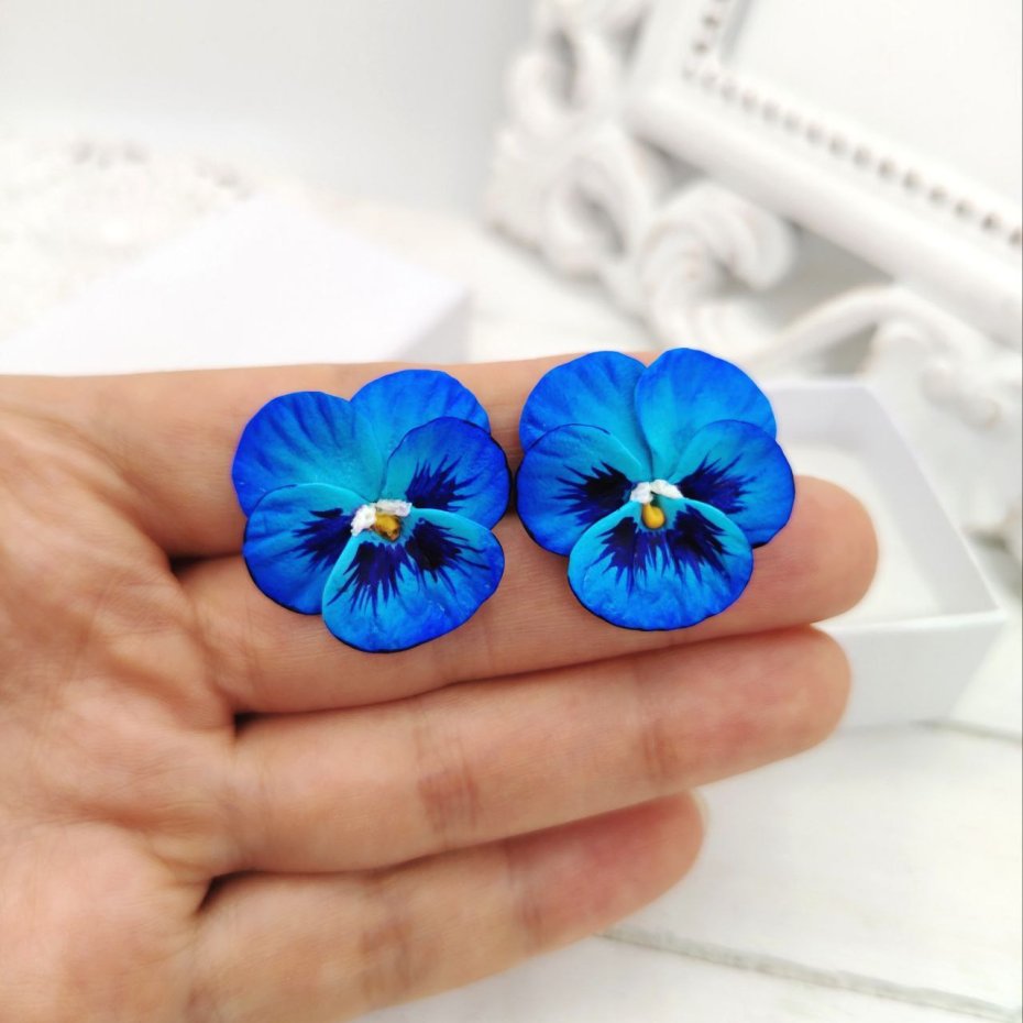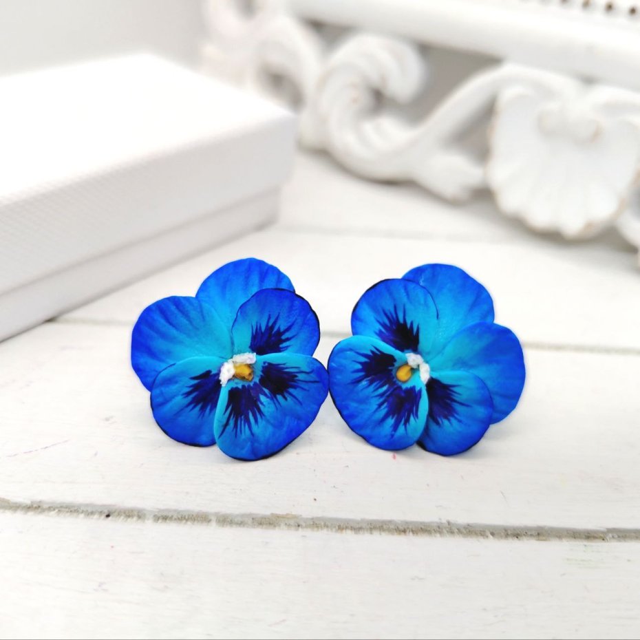 Kolczyki sztyfty w formie kwiatów bratków w odcieniach błękitu i niebieskiego. Wykonane z gliny polimerowej, ręcznie malowane i pokryte wodoodpornym lakierem. F urnitura ze stali nierdzewnej gwarantuje trwałość oraz bezpieczeństwo noszenia.