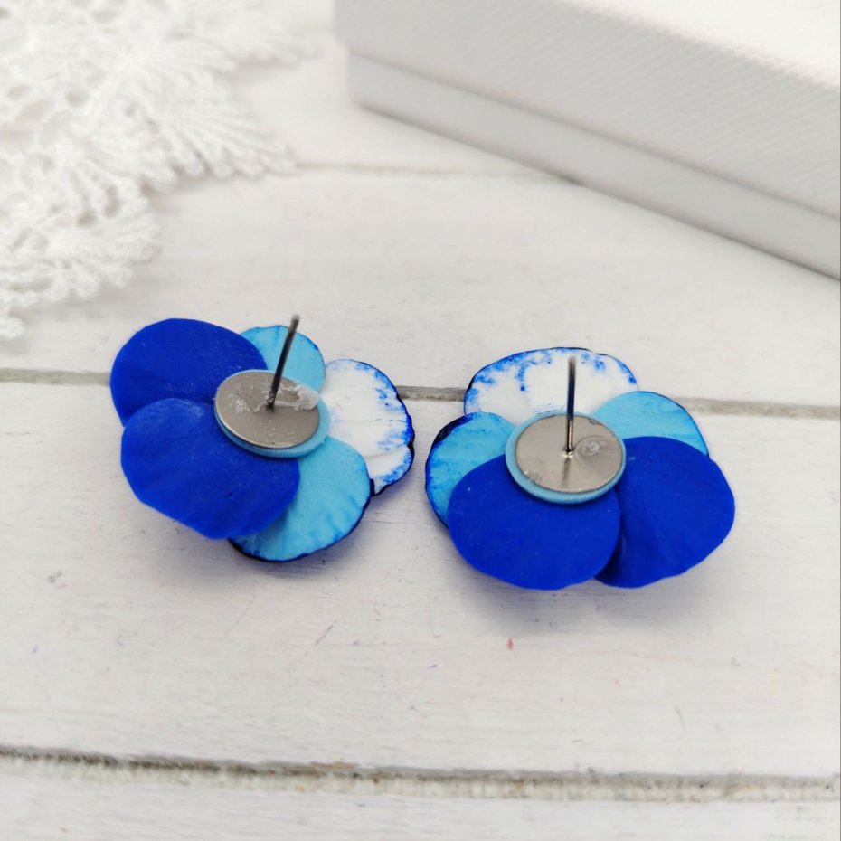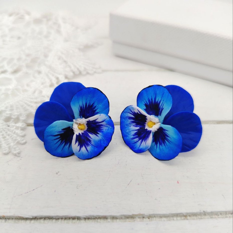 Kolczyki sztyfty w formie kwiatów bratków w odcieniach błękitu i niebieskiego. Wykonane z gliny polimerowej, ręcznie malowane i pokryte wodoodpornym lakierem. F urnitura ze stali nierdzewnej gwarantuje trwałość oraz bezpieczeństwo noszenia.