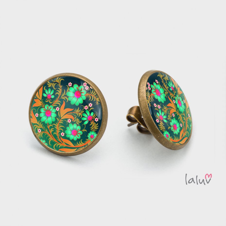 Ręcznie robione kolczyki z wysokiej jakości grafiką zamkniętą pod wypukłym szkiełkiem i oprawioną w antyalergiczną bazę w kolorze antycznego złota. Każda para zaopatrzona jest w zatyczki w kolorze bazy zapobiegające wypadaniu kolczyków z uszu. ;)