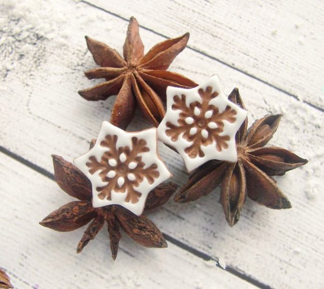 Kolczyki sztyfty świąteczne pierniczki w kształcie lukrowanych gwiazdek wykonane ręcznie z masy fimo. Wielkość gwiazdek: 1,7cm. Zatyczki w zestawie.