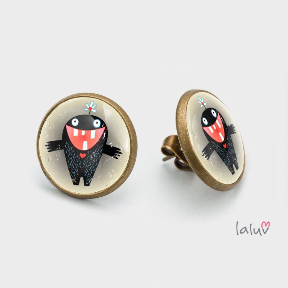 Ręcznie robione kolczyki z wysokiej jakości grafiką zamkniętą pod wypukłym szkiełkiem i oprawioną w antyalergiczną bazę w kolorze antycznego złota. Każda para zaopatrzona jest w zatyczki w kolorze bazy zapobiegające wypadaniu kolczyków z uszu. ;)