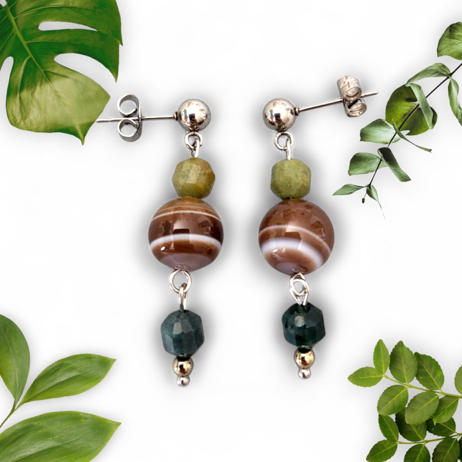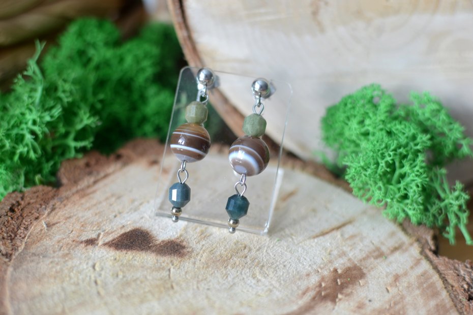 Delikatne, urocze kolczyki na sztyftach z agatami (śr. 10mm i 4mm). Sztyfty oraz zatyczki (baranki) wykonane są ze stali chirurgicznej.