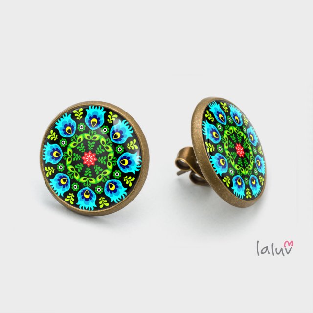 Ręcznie robione kolczyki z wysokiej jakości grafiką zamkniętą pod wypukłym szkiełkiem i oprawioną w antyalergiczną bazę w kolorze antycznego złota. Każda para zaopatrzona jest w zatyczki w kolorze bazy zapobiegające wypadaniu kolczyków z uszu. ;)