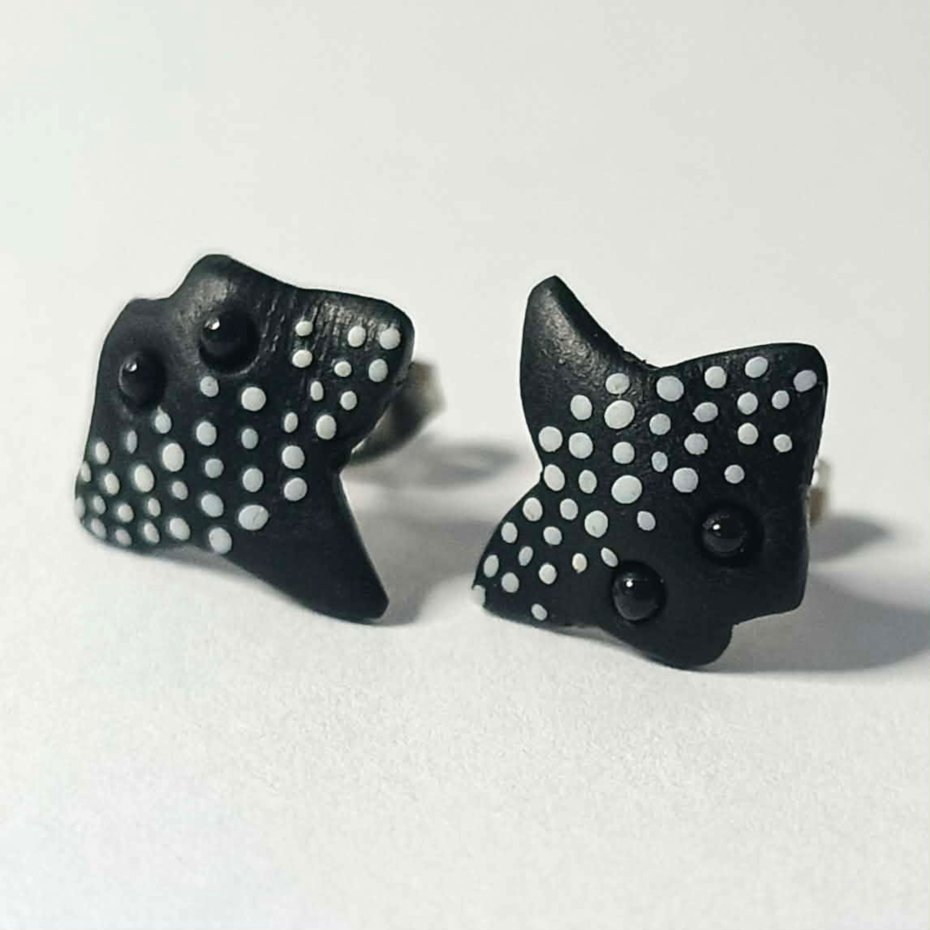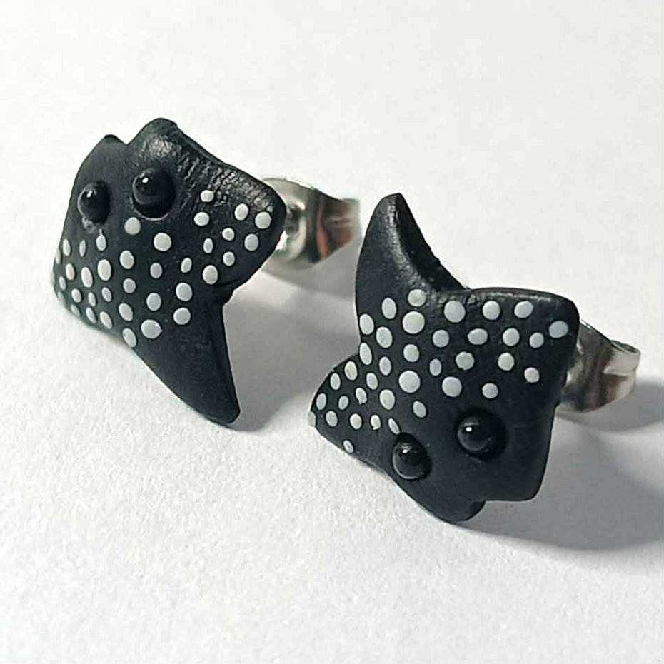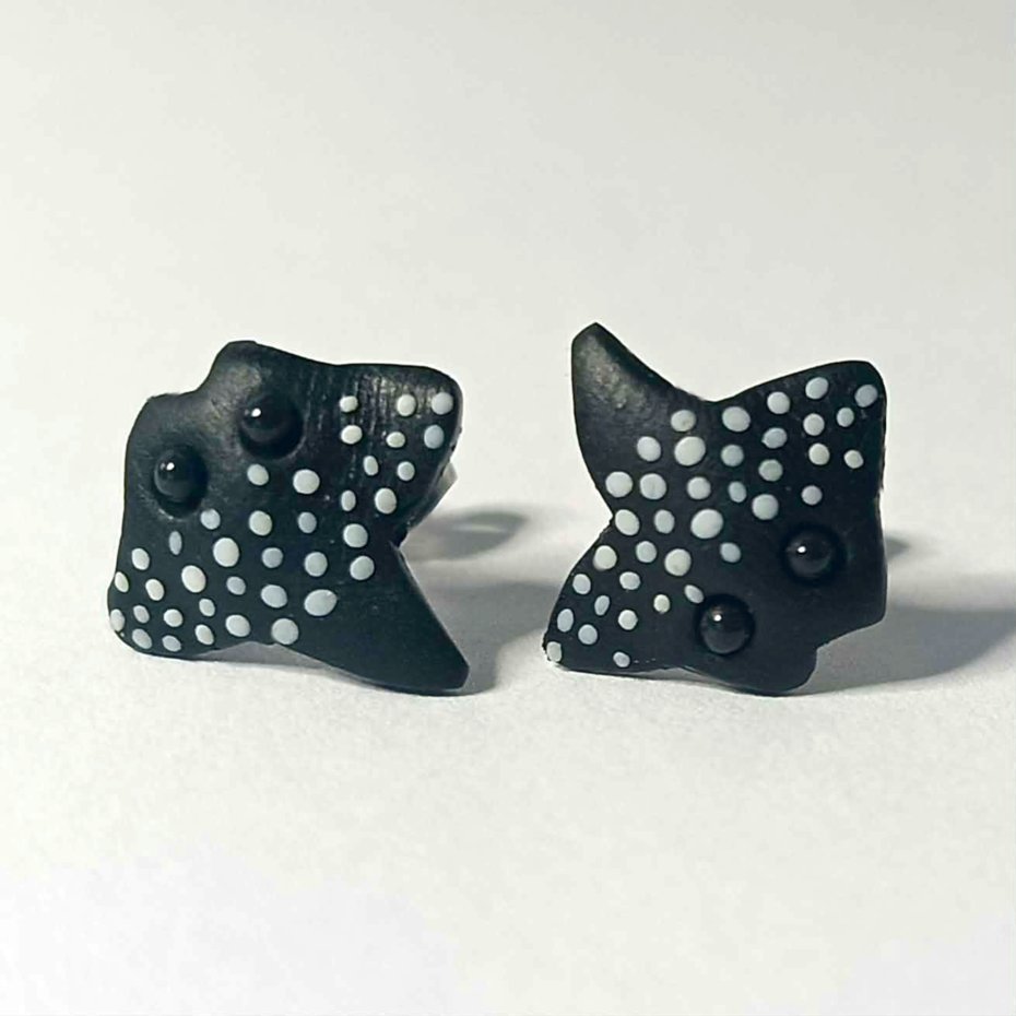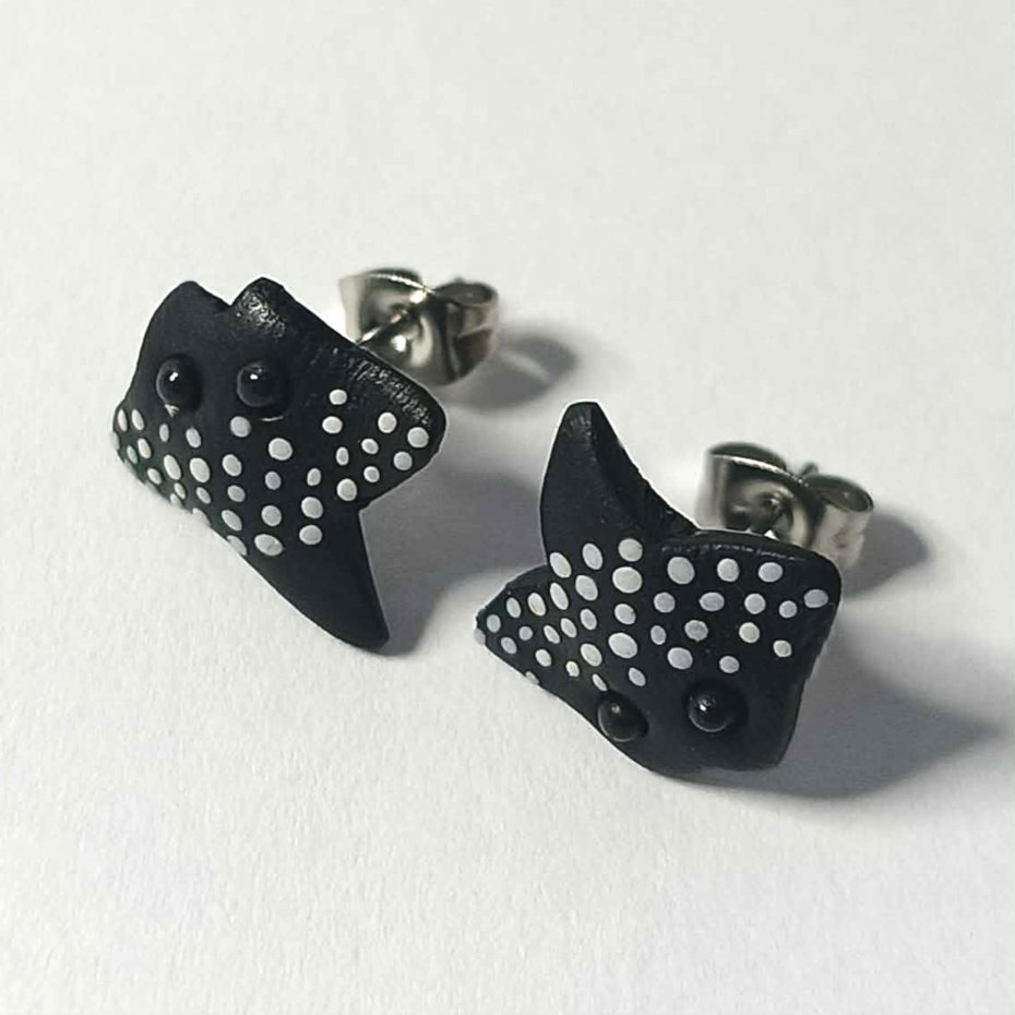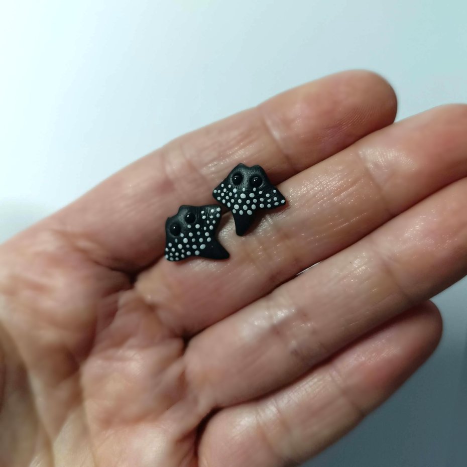 Ręcznie wykonane kolczyki sztyfty w kształcie płaszczki, inspirowane podwodnym światem. Czarne z delikatnymi, białymi kropkami, nawiązują do wyglądu płaszczek rafowych.