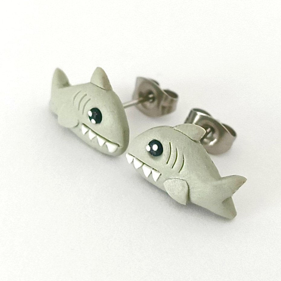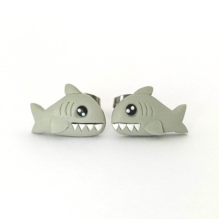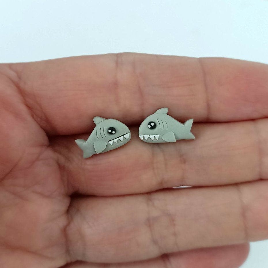 Ręcznie wykonane kolczyki sztyfty w kształcie uroczych rekinów. Delikatny, jasnoszary kolor i zabawne detale z ząbkami nadają im lekko humorystyczny, ale wciąż minimalistyczny charakter.