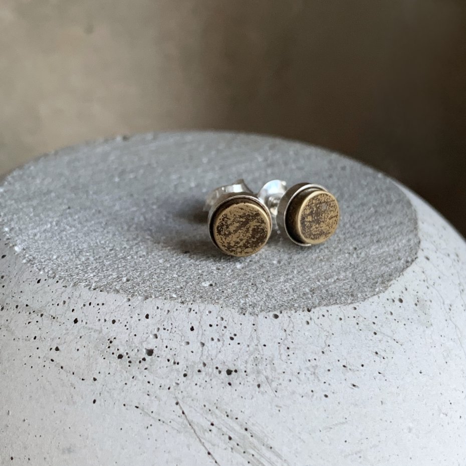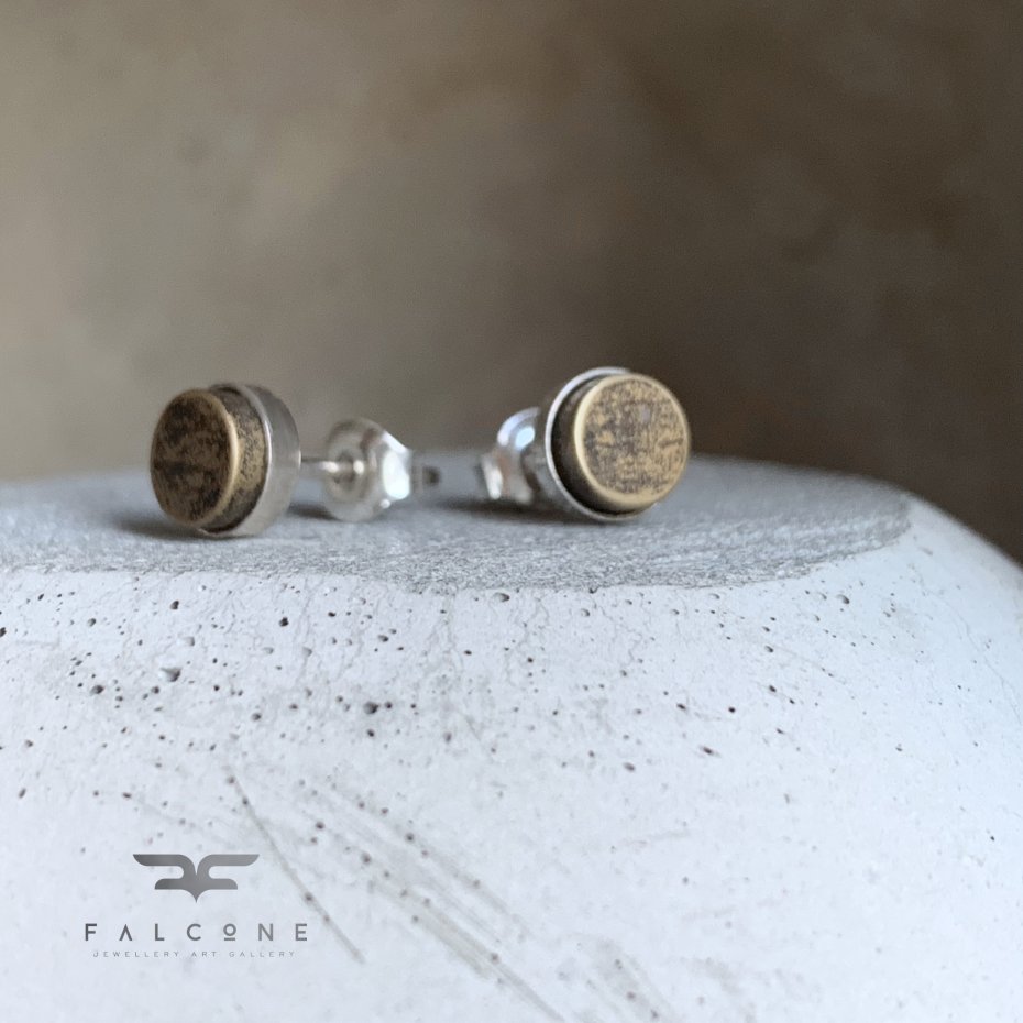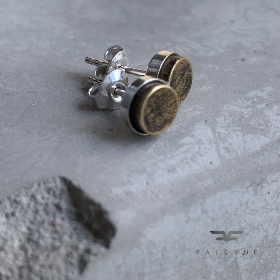 Kolczyki ze srebra typu sztyfty. Kolczyki wykonane z jasnego polerowanego srebra. Wyjątkowe połączenie z kaboszonami z patynowanego mosiądzu. Unikalne wzory ciemnych plamek z przetarciami, kontrastują z jasną barwą srebra tworząc efektowne połączenie. Średnica kolczyków to 6 mm. Zapięcie typu sztyfty ze srebra 925.