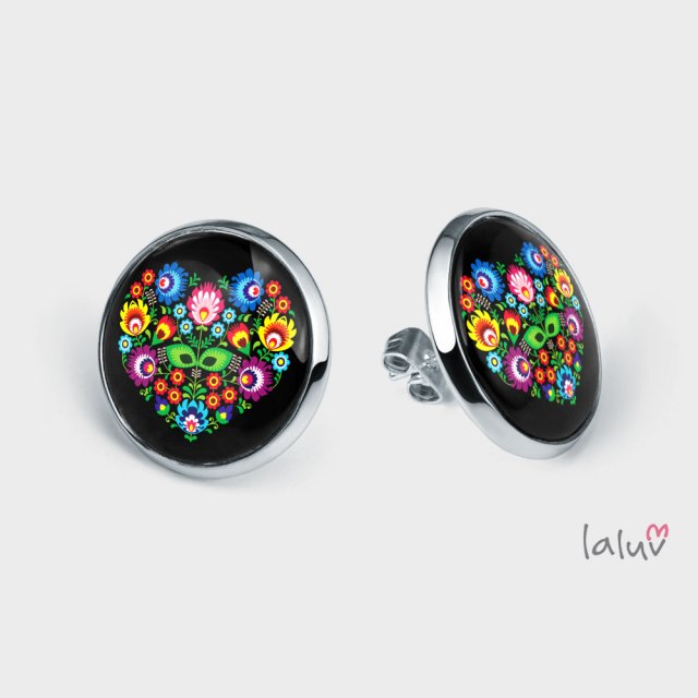 Ręcznie robione kolczyki z wysokiej jakości grafiką zamkniętą pod wypukłym szkiełkiem i oprawioną w antyalergiczną bazę w kolorze srebrnym. Każda para zaopatrzona jest w zatyczki w kolorze bazy zapobiegające wypadaniu kolczyków z uszu. ;)