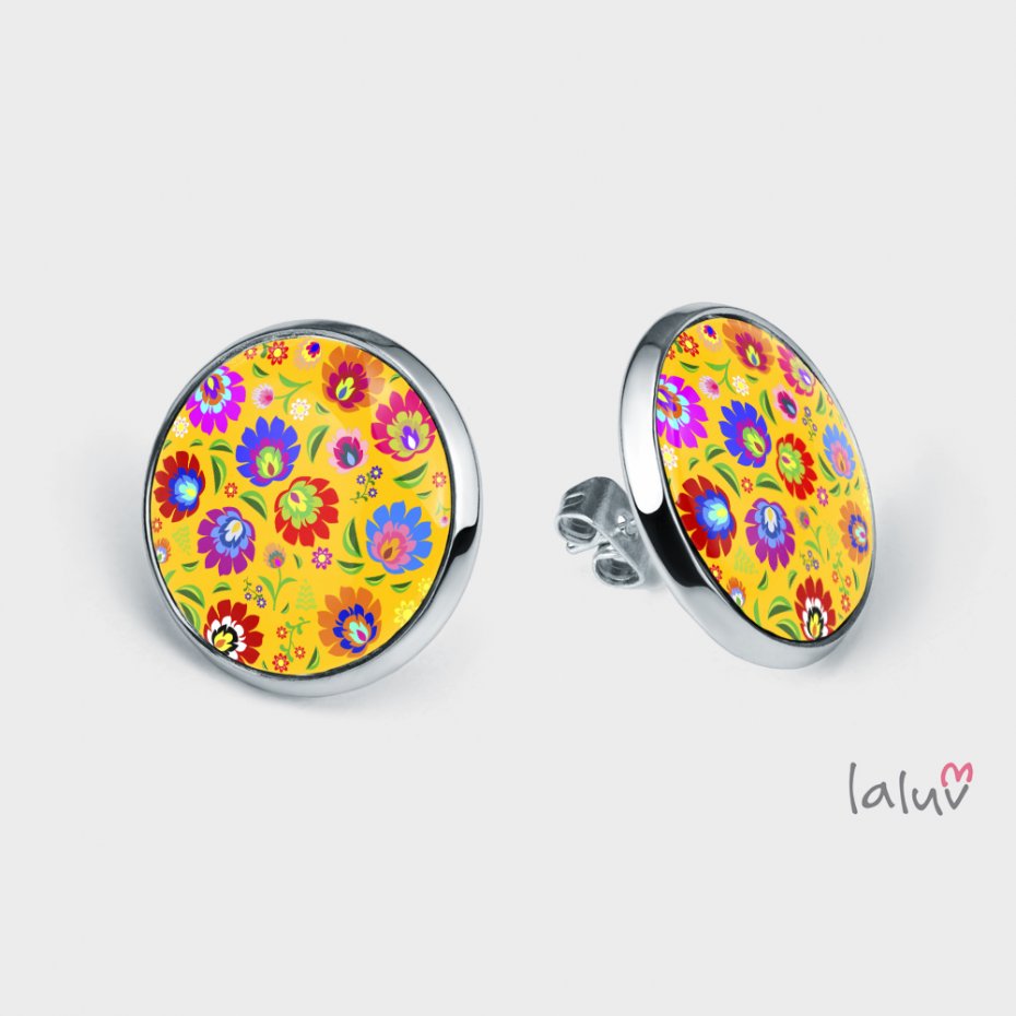 Ręcznie robione kolczyki z wysokiej jakości grafiką zamkniętą pod wypukłym szkiełkiem i oprawioną w antyalergiczną bazę w kolorze srebrnym. Każda para zaopatrzona jest w zatyczki w kolorze bazy zapobiegające wypadaniu kolczyków z uszu. ;)