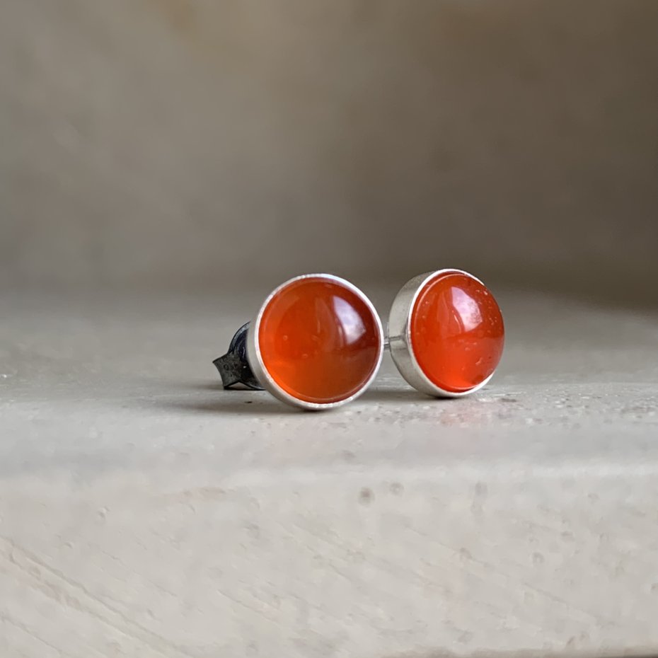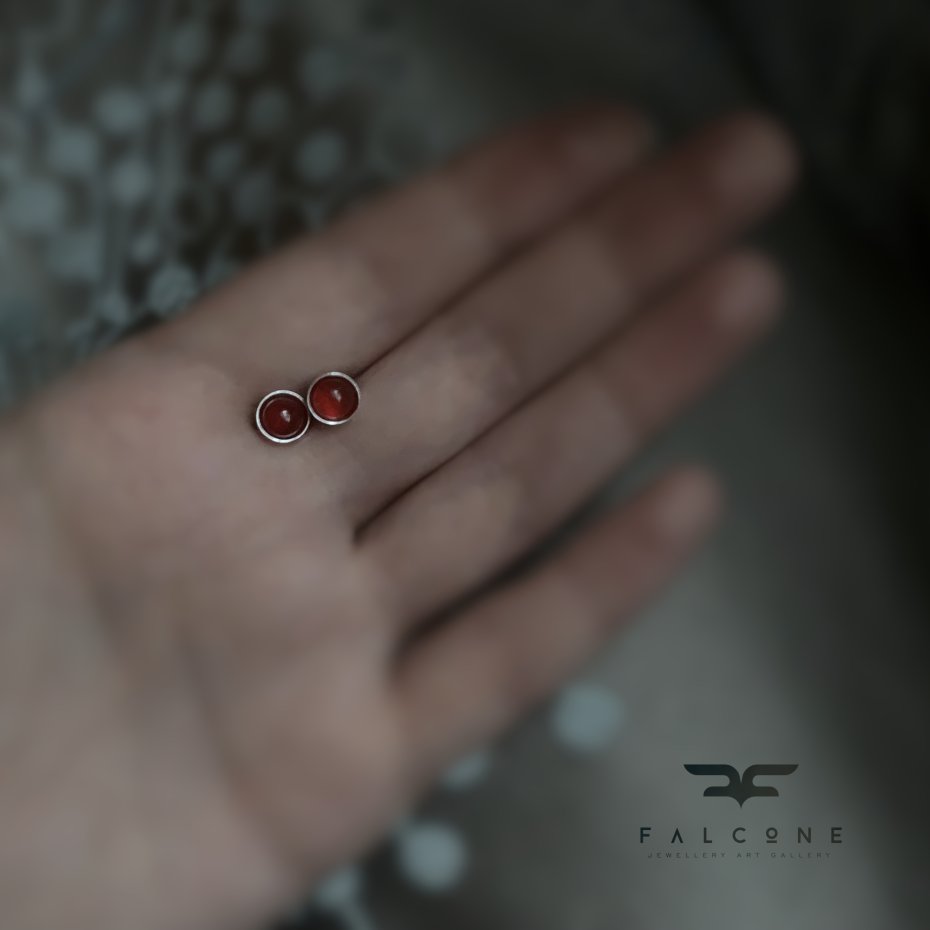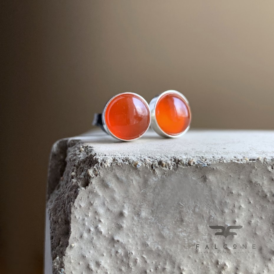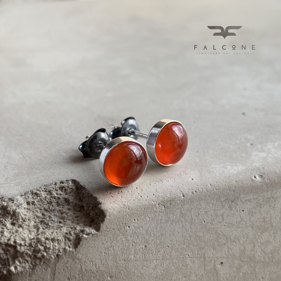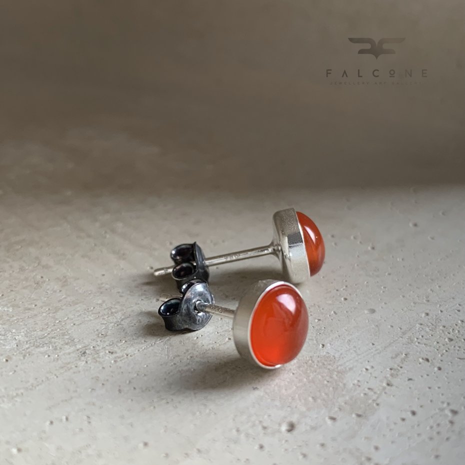 Kolczyki ze srebra i karneolu. Jasne, polerowane srebro stanowi oprawę dla kaboszonów z karneolu. Kaboszony mają gładki szlif, subtelną przejrzystość i charakterystyczną ciepłą barwę pomiędzy czerwienią, a pomarańczem. Średnica kaboszonów to ok. 6 mm. Zapięcie typu sztyfty ze srebra 925.