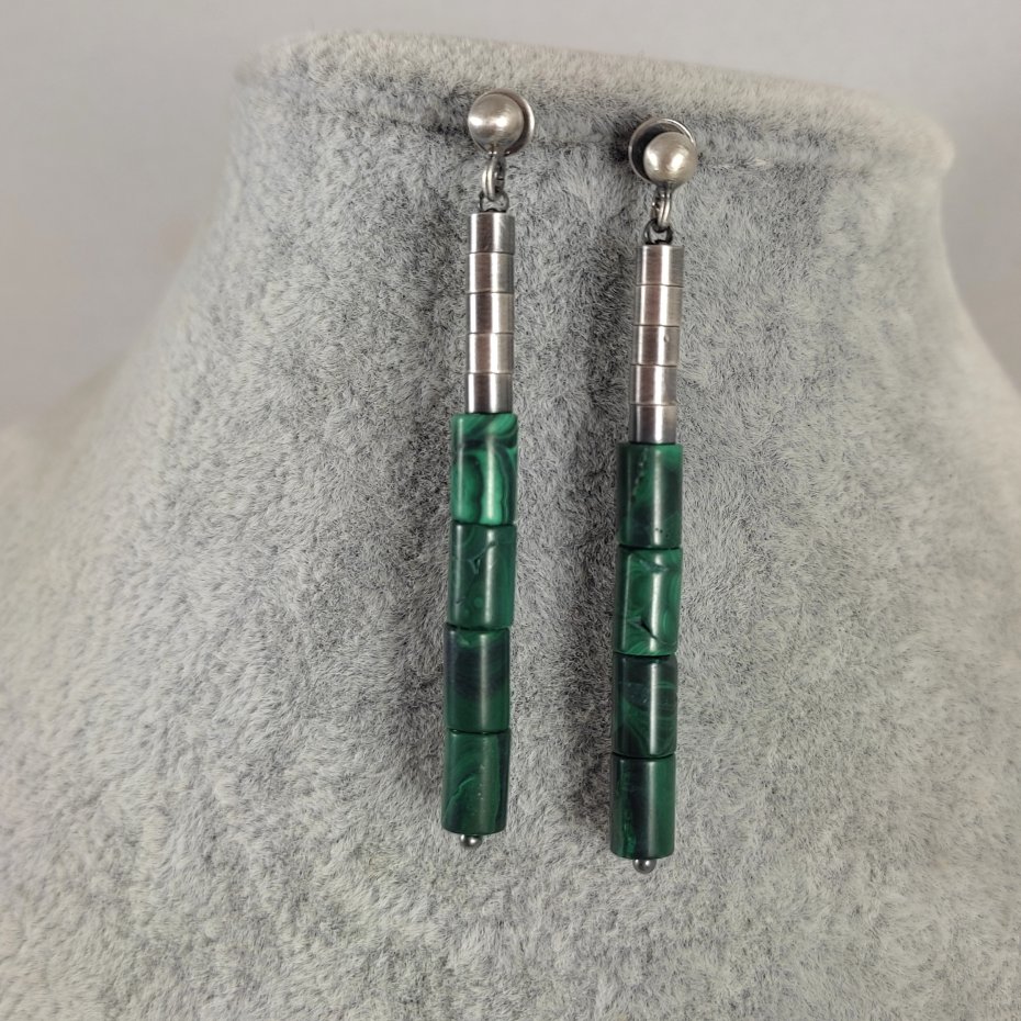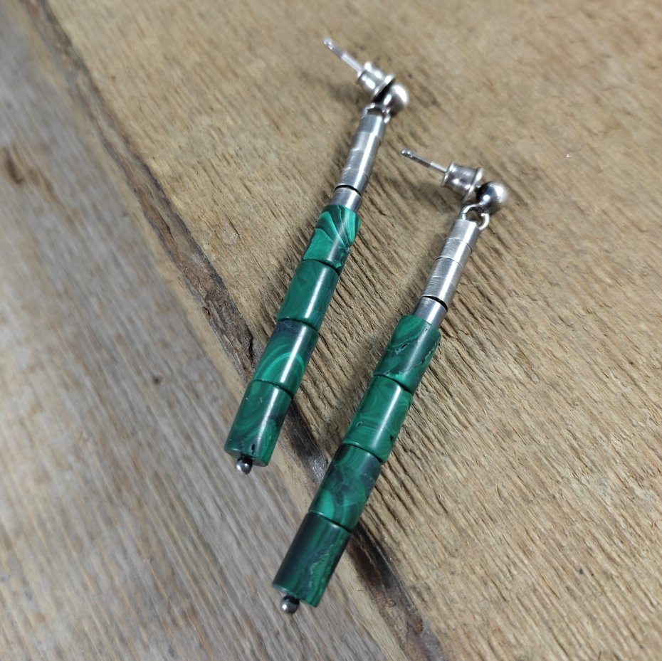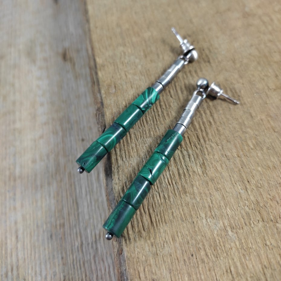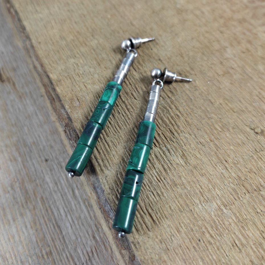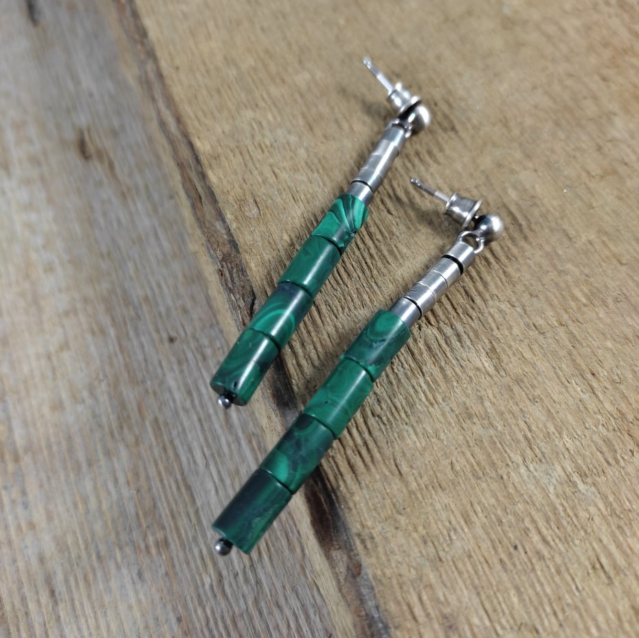 Kolczyki z walców malachit. Malachit o wielkości 5/8 mm. Kamienie posiadają niedoskonałości. Długość całkowita kolczyków wynosi ok. 5,8 cm. Kolczyki zostały wykonane w całości ze srebra 925, srebro oksydowane. Zapakowane w eleganckie pudełko.