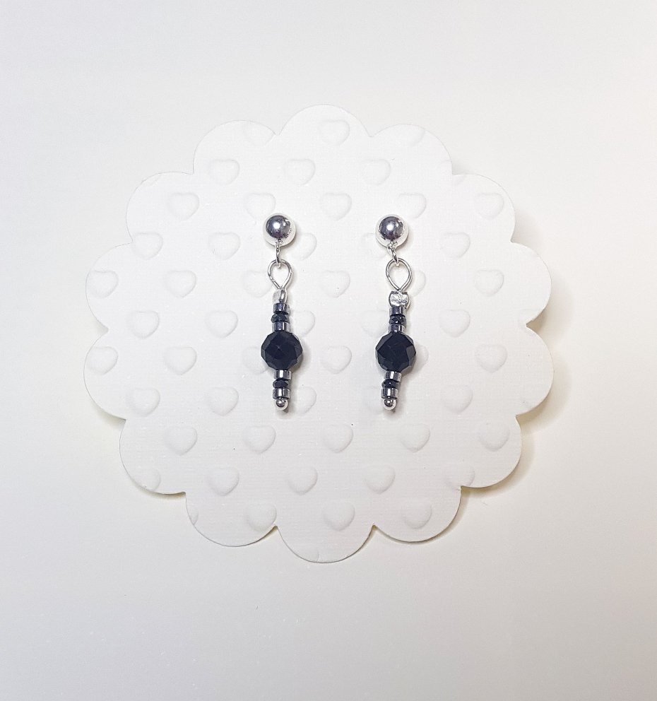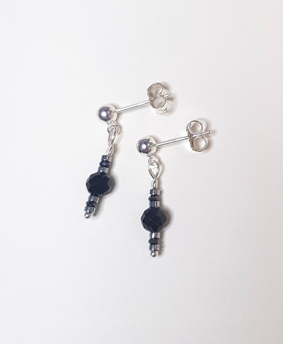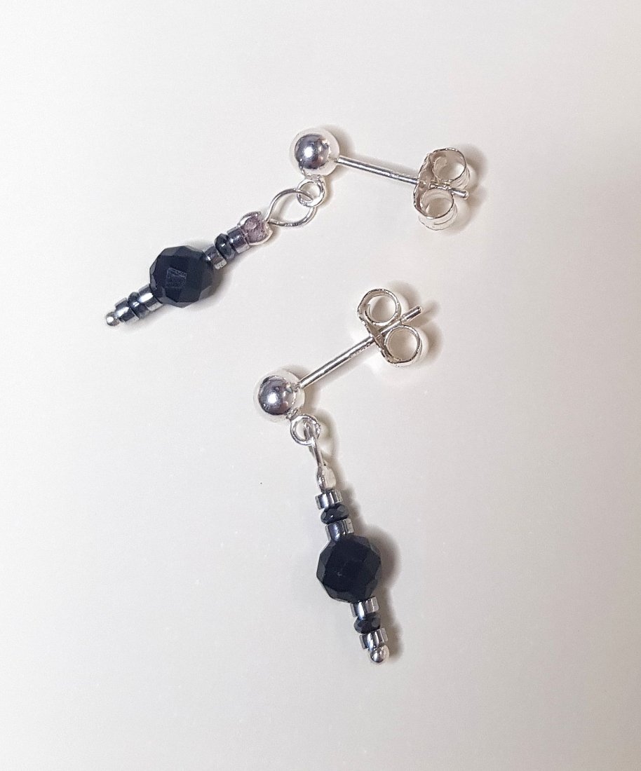 Wykonane z fasetowanego turmalinu, fasetowanych oponek hematytu i drobnych srebrnych plasterków hematytu.
