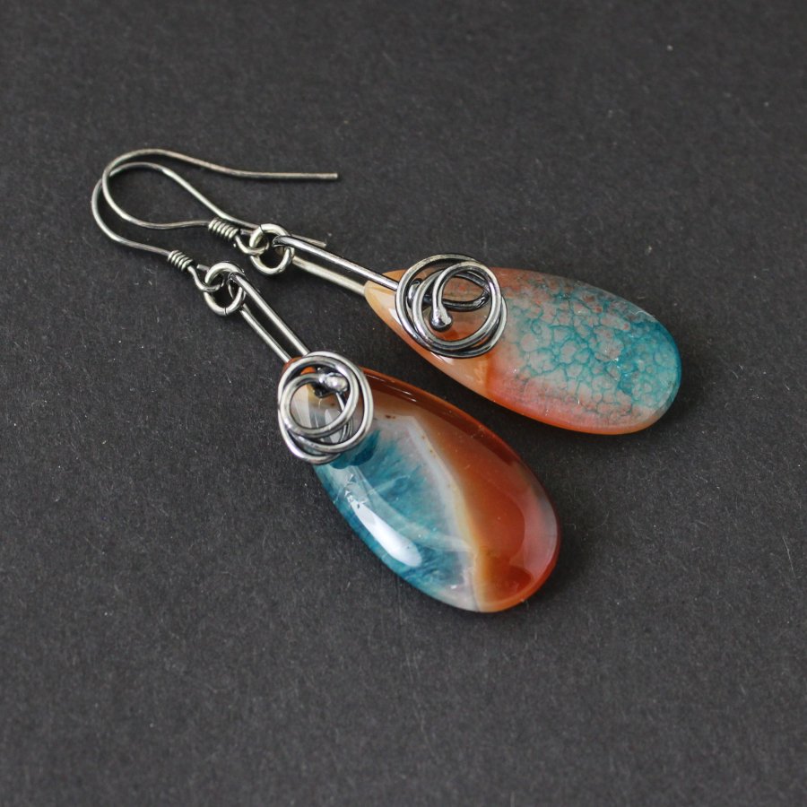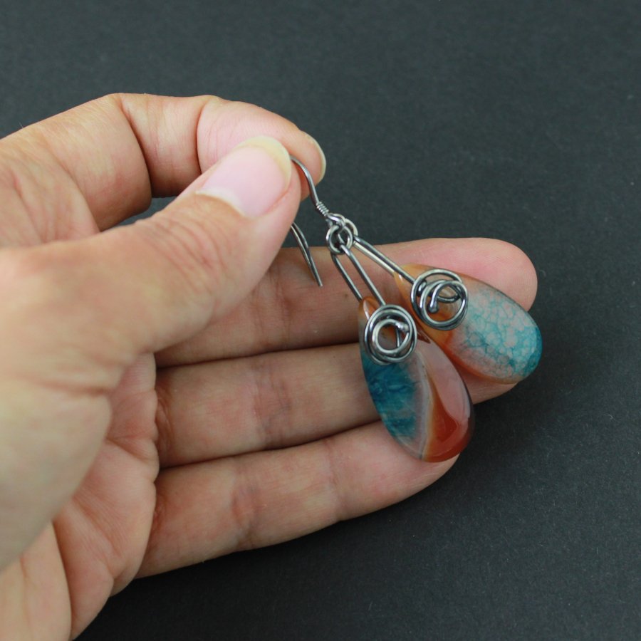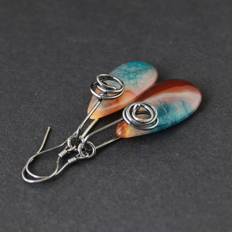 Agat w tych kolczykach wygląda, jakby zatrzymał w sobie ruch dwóch żywiołów — ciepła i chłodu. Kroplowaty, łagodnie wydłużony kształt przypomina miniaturową łzę ziemi, w której natura zapisała własne historie. Barwy przechodzą tu płynnie: rdzawe oranże przypominają rozżarzone popołudnie, mleczne i jasne smugi tworzą delikatne przełamania, a głęboki turkus pęka subtelną siateczką, niczym wyschnięta glina nad brzegiem wody. Każdy fragment tego agatu wygląda jak kadr krajobrazu — raz pustynnego, raz morskiego.