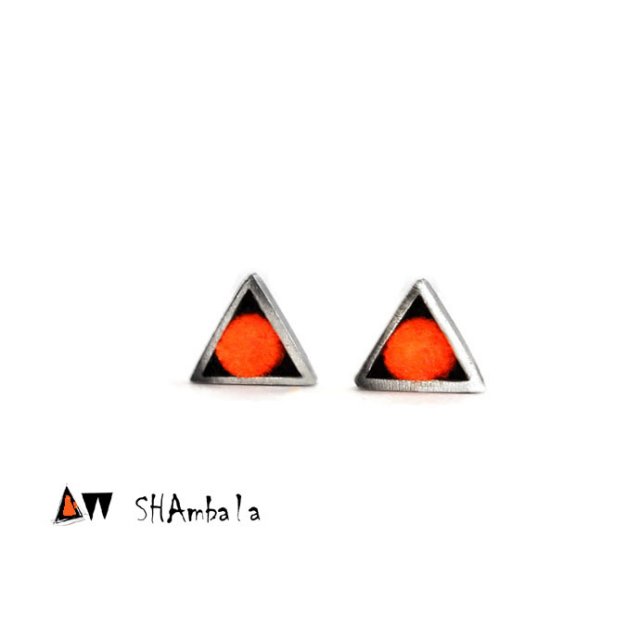 Urocze, drobne kolczyki na sztyft. Wewnątrz srebrnego trójkąta osadzona jest urocza, mała kulka akrylowa w kolorze fluorescencyjnego pomarańczu. Kolczyki wykonane zostały z delikatnie oksydowanego srebra. Bok trójkąta wynosi 1 cm. Akryl barwiony jest przeze mnie własnoręcznie, dzięki czemu kuleczki mają swój unikatowy, niepowtarzalny charakter. Gorąco polecam:)