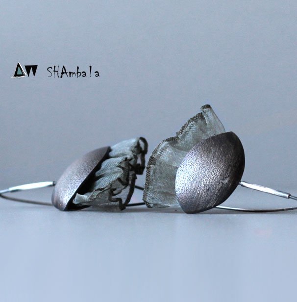 Eleganckie, efektowne kolczyki. Lekkie i finezyjne. Wykonane zostały z surowego, oksydowanego srebra zestawionego z delikatną tkaniną w kolorze khaki.