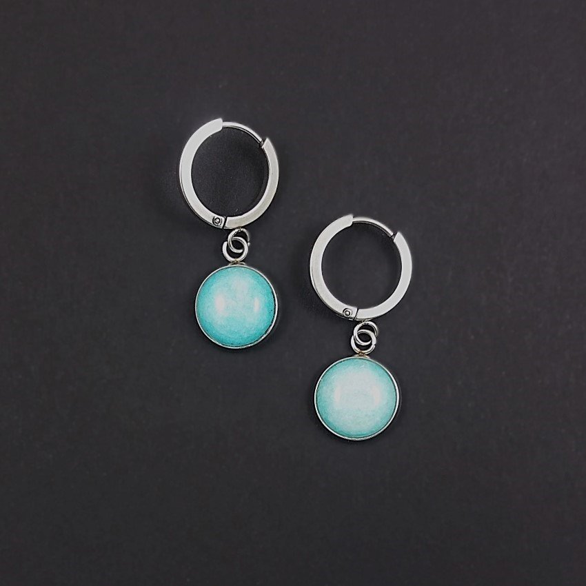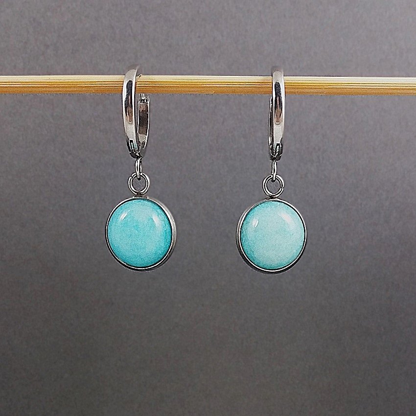 Bardzo twarzowe kolczyki z nieuczulającej stali szlachetnej w pięknym kolorze starego srebra. Na wygodnych biglach typu kajdanki zawieszone są kaboszony z gładkich jadeitów w kolorze amazonitu (jasny turkus). Kamienie mają średnicę 10mm.