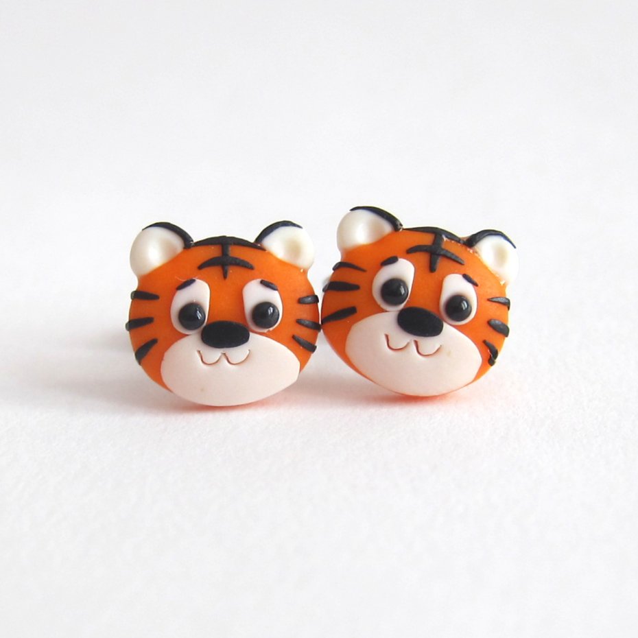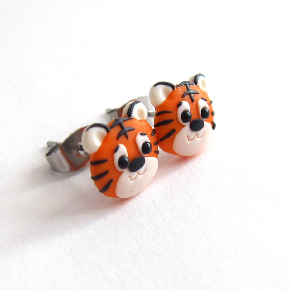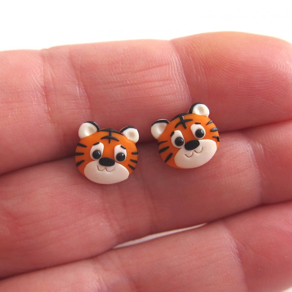Zabawne kolczyki emoji wykonane ręcznie z masy termoutwardzalnej Fimo w kształcie słodkich tygrysów. Wielkość kolczyków to ok. 1,1 cm. Sztyfty wykonane są ze stali chirurgicznej. Kolczyki świetne na prezent. Zobacz moją całą galerię w Decobazaar!