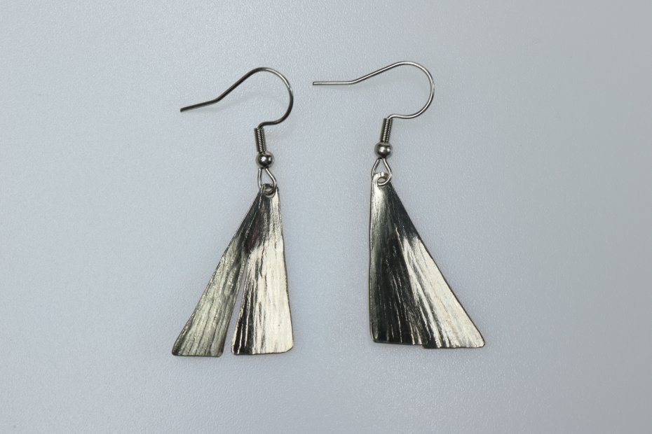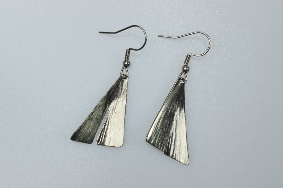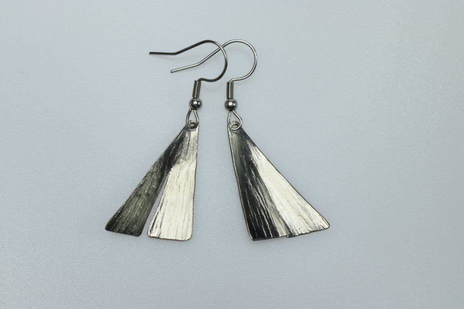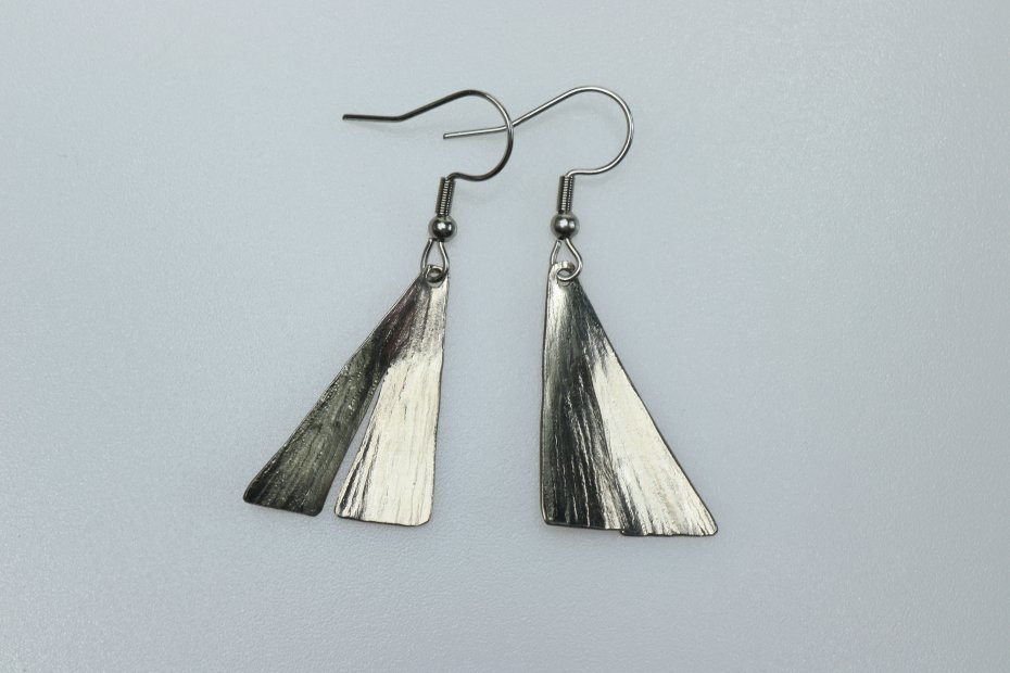 Kolczyki ręcznie wykonane z tytanu Grade I i stali chirurgicznej. Tytan szczotkowany. Długość z biglem 5 cm. Kolczyki są bardzo lekkie (waga pary 4 g) i nie uczulają.