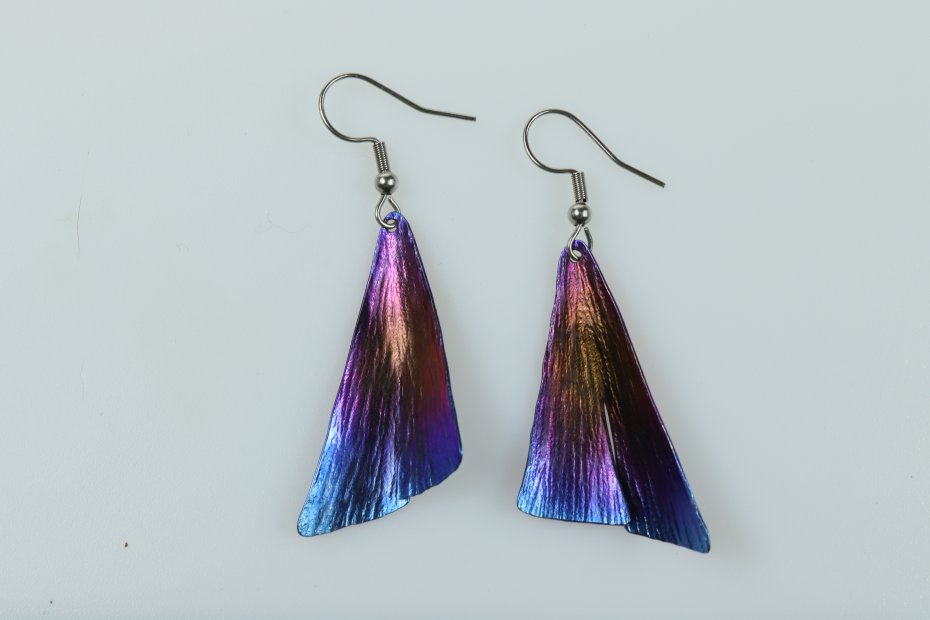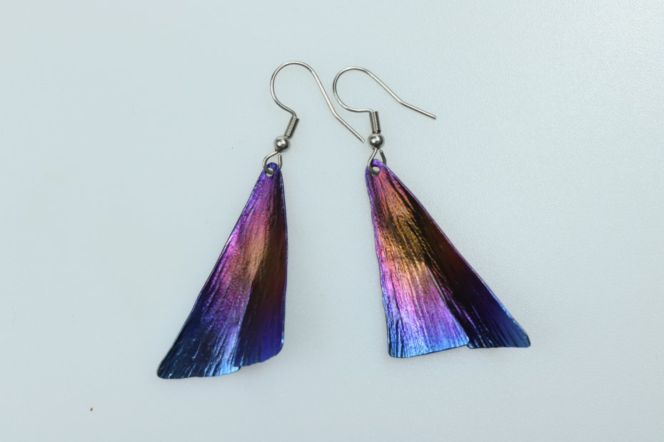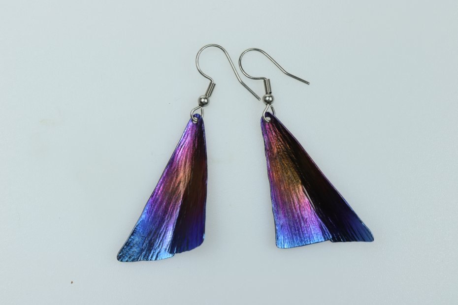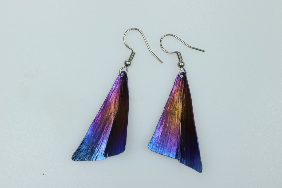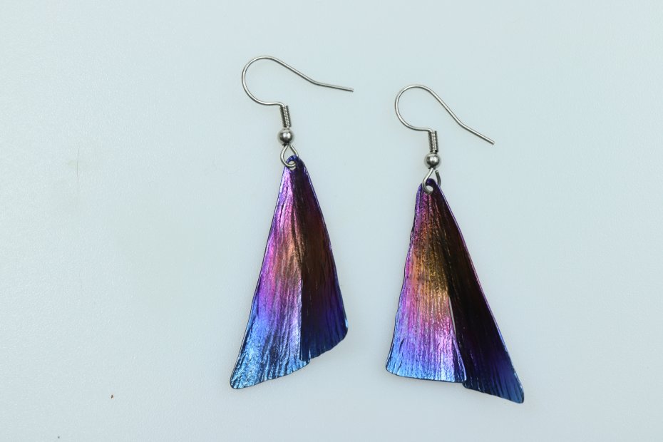 Kolczyki ręcznie wykonane z tytanu Grade I i stali chirurgicznej. Tytan szczotkowany. Długość z biglem 5.5 cm. Sama zawieszka 4 cm x 2 cm. Kolczyki są bardzo lekkie (waga pary 4 g) i nie uczulają.