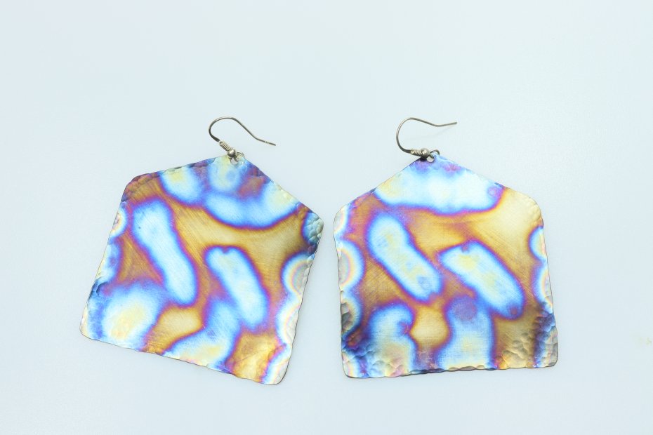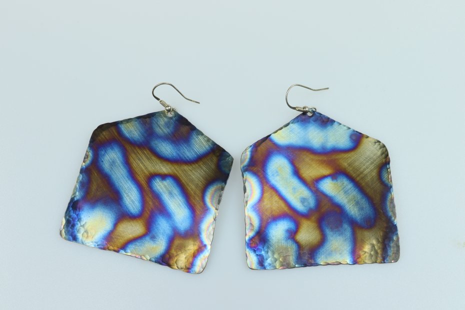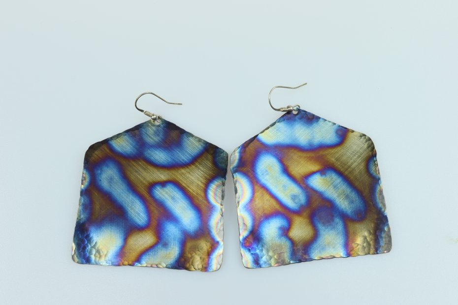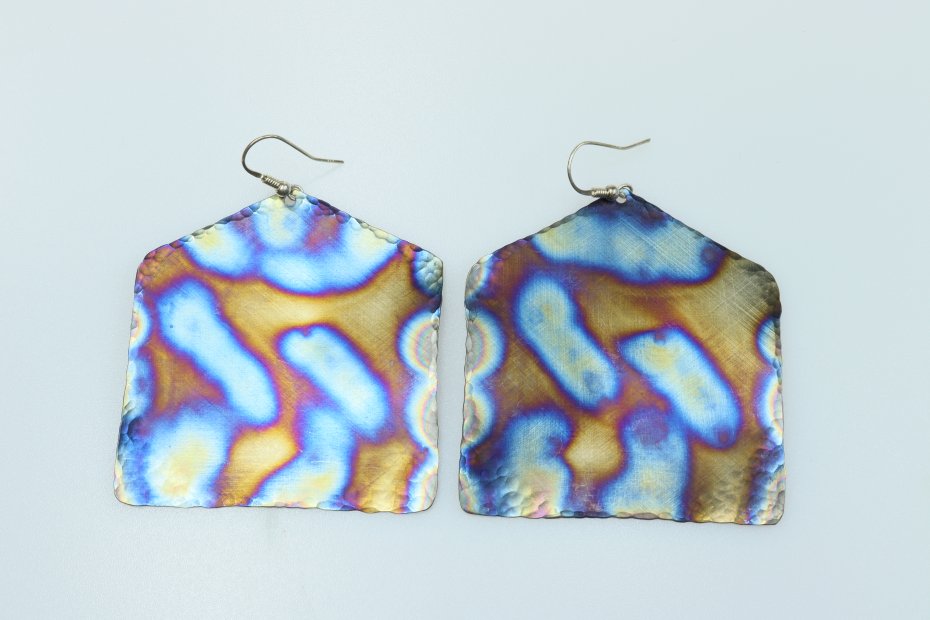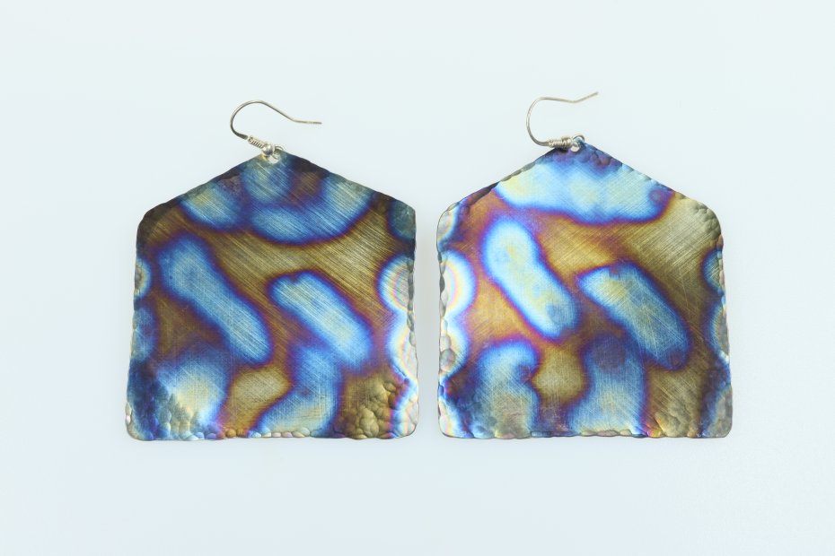 Kolczyki ręcznie wykonane z tytanu Grade I. Tytan satynowany. Długość z biglem 7.5 cm. "Domek" ma szerokość 6 cm. Kolczyki są bardzo lekkie (waga pary 10 g) i hipoalergiczne.