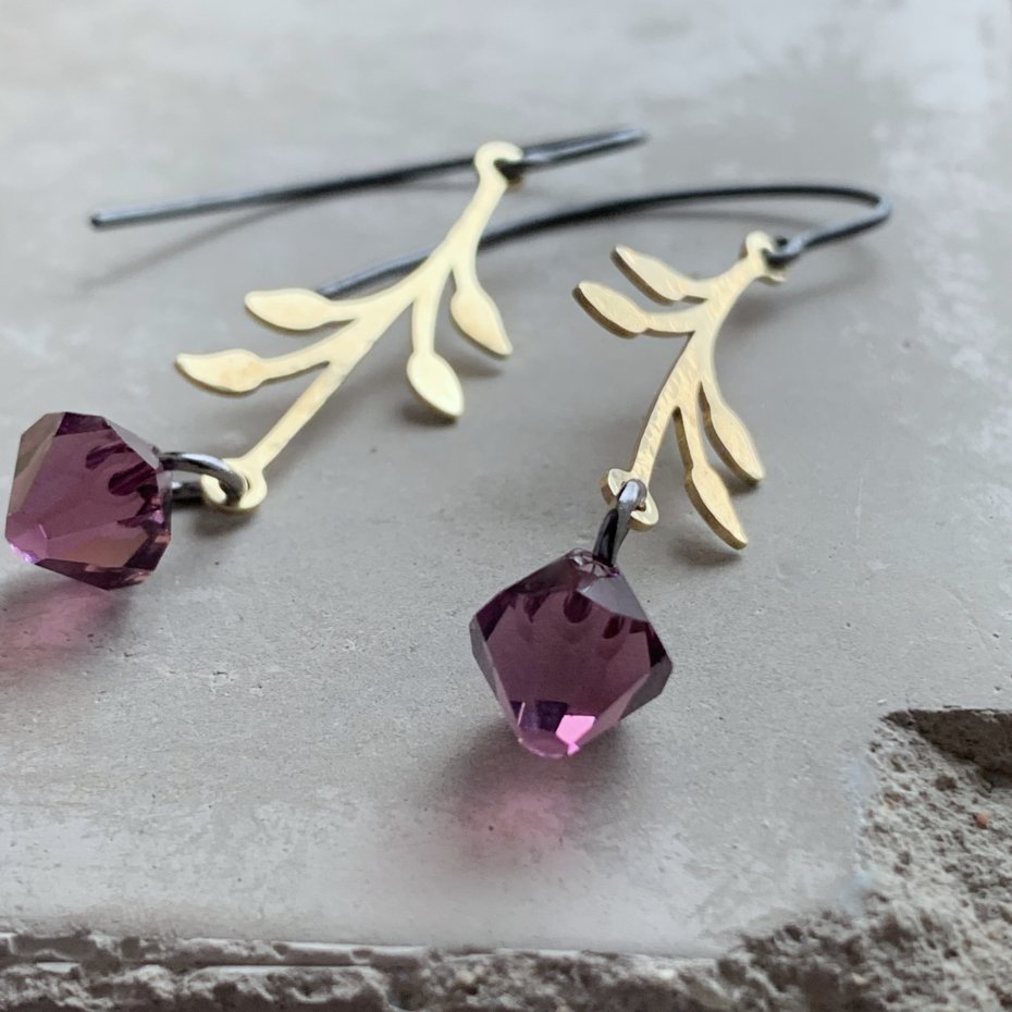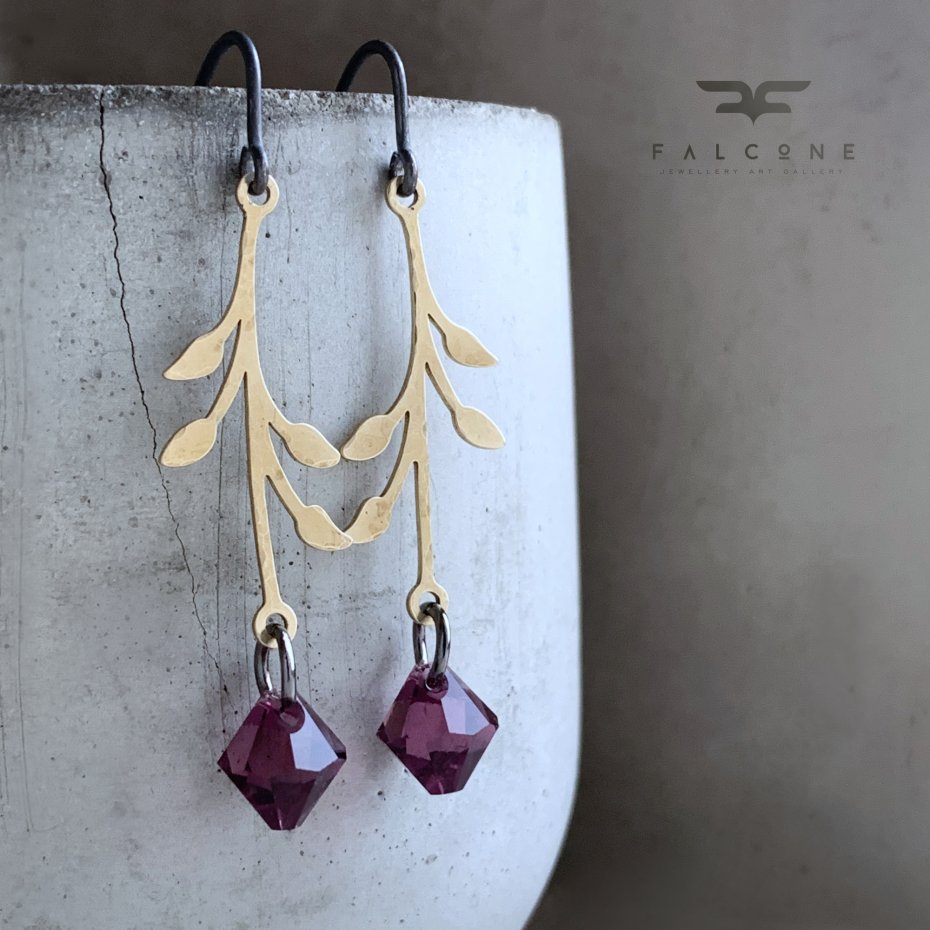 Kolczyki ze srebra, mosiądzu i kryształów Swarovskiego. Kolczyki w nowoczesnej formie łączące klasykę z subtelnym romantyzmem i elegancją. Swarovski o barwie Amethyst, to przejrzysty kryształ w odcieniu fioletu. Chłodną barwę kryształów przełamują łodygi w kolorze złota z repusowanego, polerowanego mosiądzu. Całość zawieszona na prostych, srebrnych biglach. Bigle typu haki ze srebra 925. Swarovski 8 mm. Długość kolczyków to ok. 5 cm.