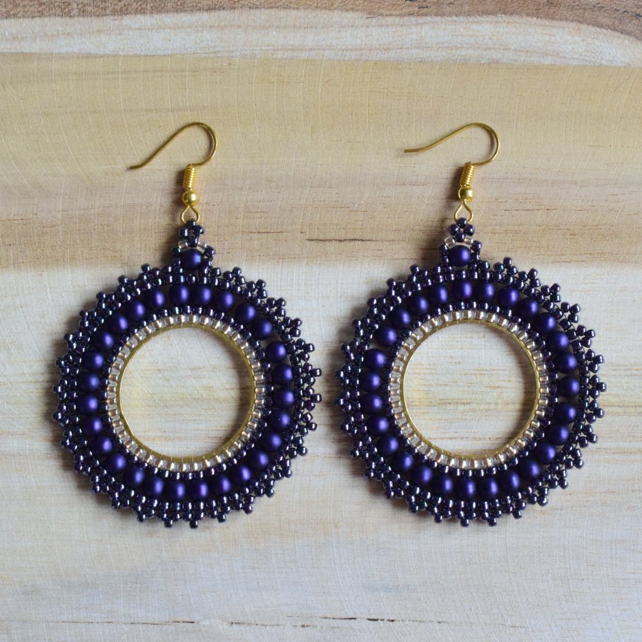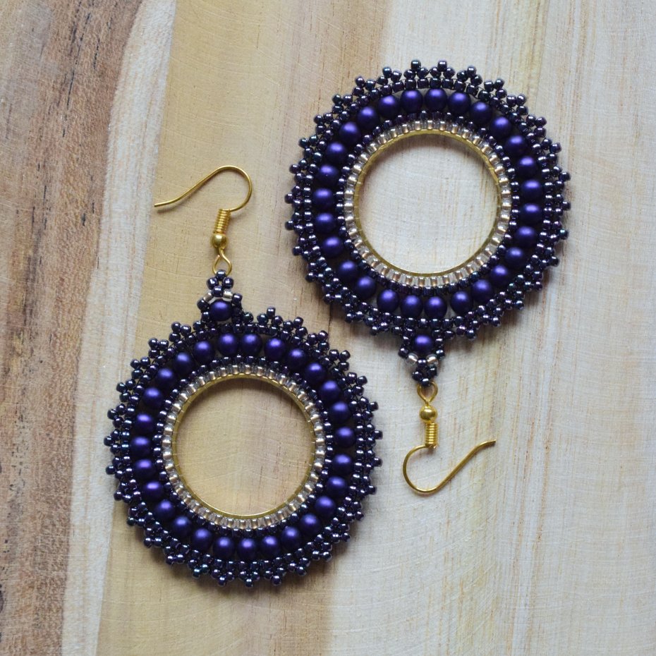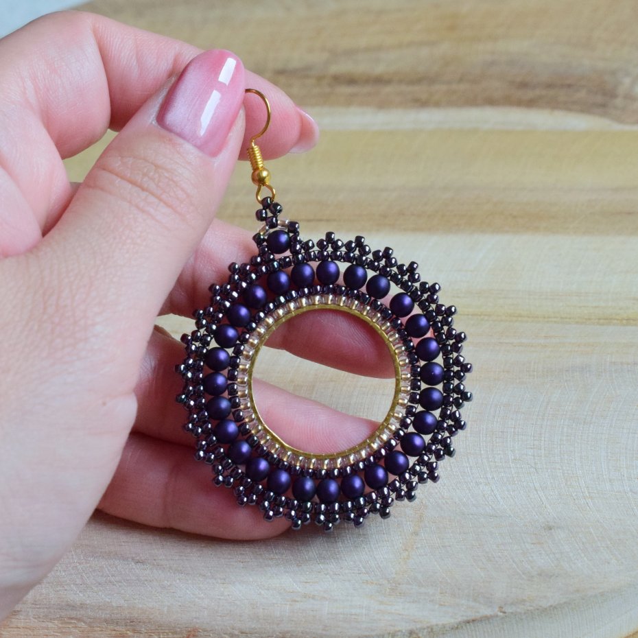 Kolczyki zostały wykonane ściegiem brick, cegiełkowym. Na okrągłej bazie ze stali szlachetnej w kolorze złota opierają się kolejne rzędy drobnych koralików Toho oraz ozdobnych kuleczek. Całość utrzymana w ciemnej, fioletowej tonacji.