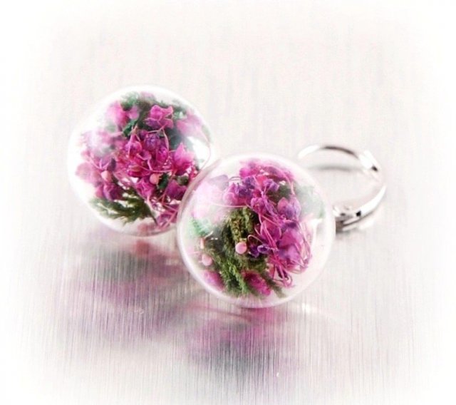 Te urocze, subtelne kolczyki są wykonane ze szklanych kul, wewnątrz których znajdują się prawdziwe, suszone, drobne kwiatki.