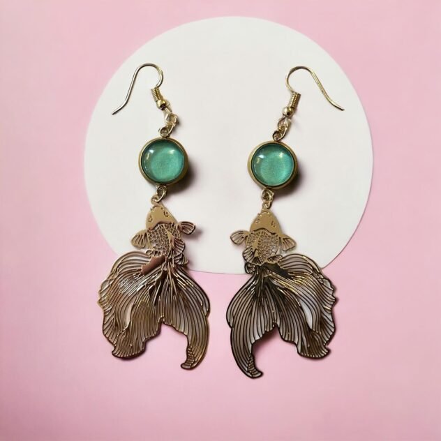 Złota zawieszka w kształcie karpia Koi – symbolu spokoju, odwagi i równowagi – pięknie komponuje się z oczkiem w kolorze seledynowym (10 mm), które dodaje całości świeżości i lekkości.