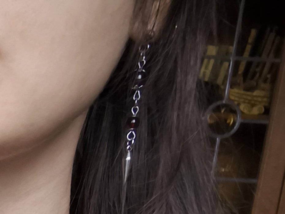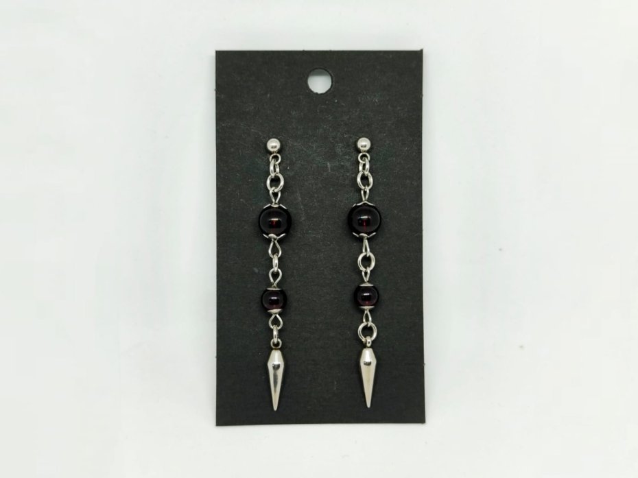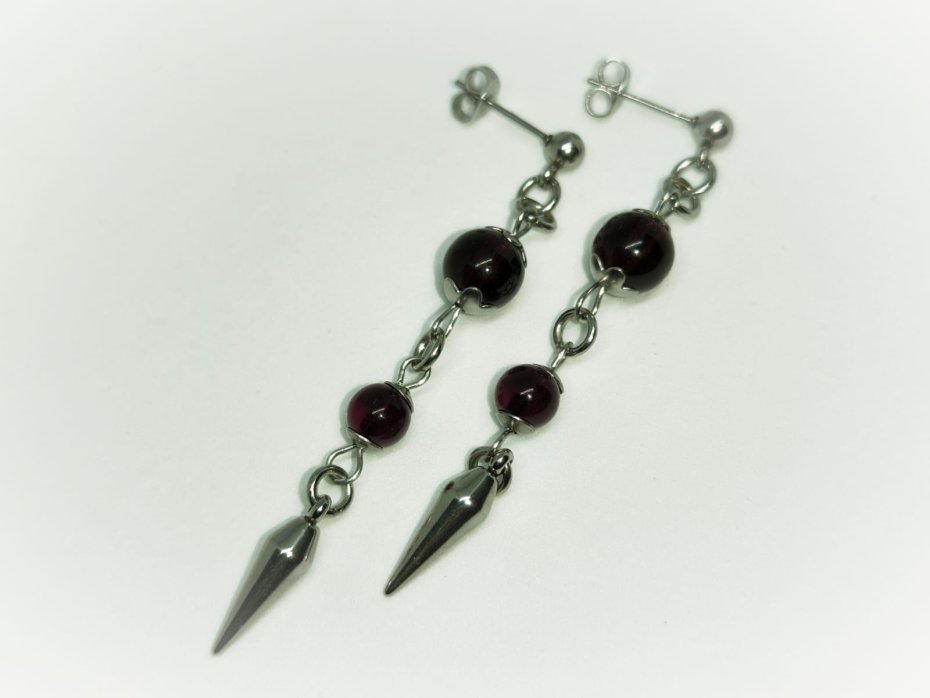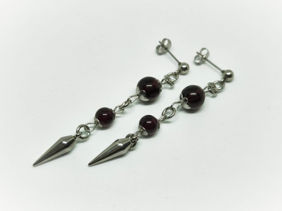 Długie, wiszące kolczyki w mrocznym stylu vampire/gothic – dla fanek ciemnej estetyki, alternative, witchy vibe i rockowego pazura. Ostre kolce przypominające kły, głęboko bordowe (prawie czarne) szklane koraliki, które w świetle delikatnie odbijają krwistą czerwień – czysta mroczna elegancja. Lekkie, pięknie się kołyszą i hipnotyzują każdym ruchem. Idealne na co dzień i na nocne wyjścia