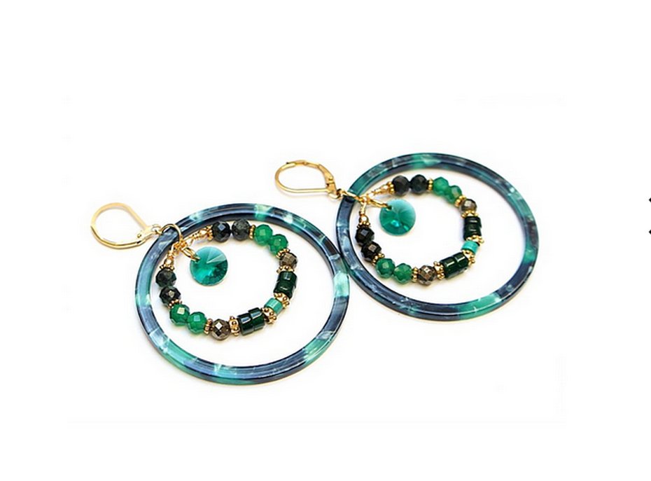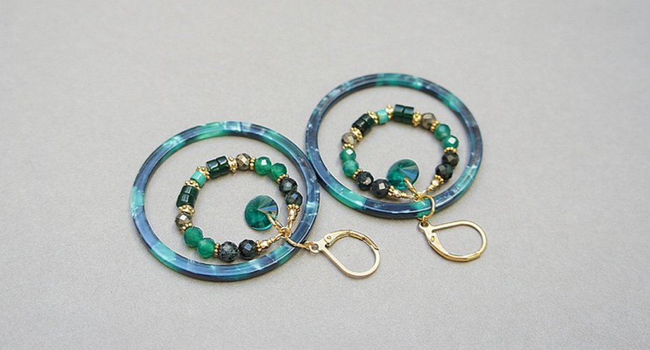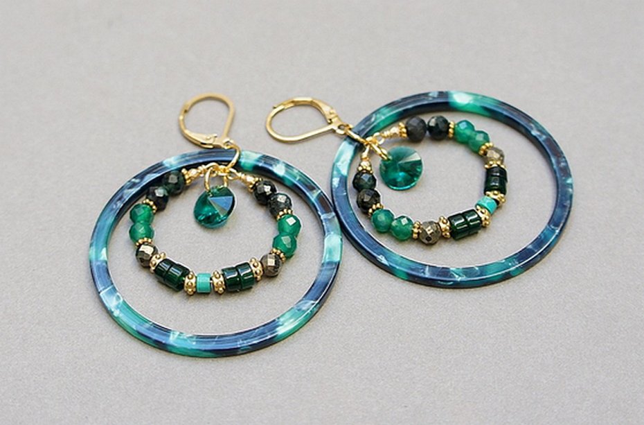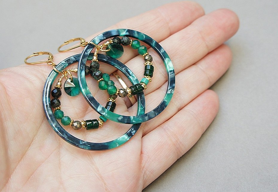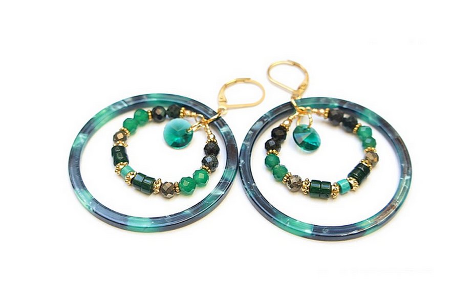 Kolczyki wykonane ze stali szlachetnej pokrytej zlotem oraz naturalnych minerałów: szmaragdy [4mm], onyks zielony [4mm], piryt [4mm], jadeit talarki [4x2mm], howlit talarki [4 x 2mm], dużych obręczy z żywicy oraz zawieszek ze szkła. Średnica kół 44mm oraz 28mm . Całkowita długość kolczyków 6,2cm. Biżuteria ozdobnie zapakowana.