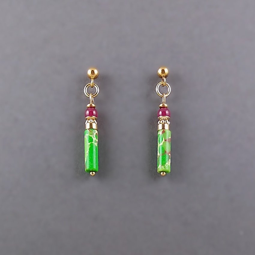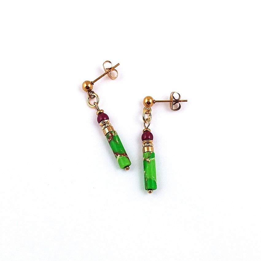 Kolorowe, soczysto zielono wiśniowe kolczyki z nieuczulającej, pozłacanej stali szlachetnej. Na sztyftach kulkach zawieszone są słupki jaspisowe i gładkie kulki z rubinu. Kamienie mają średnicę 4 mm.