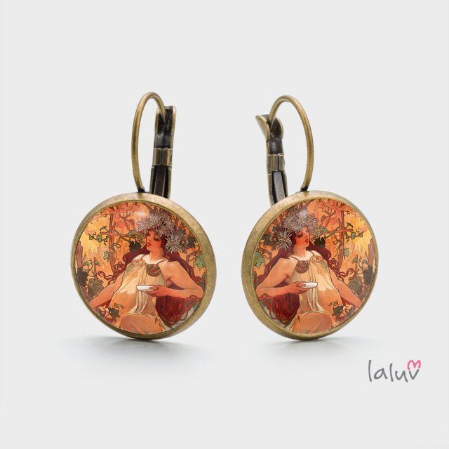 Ręcznie robione kolczyki z wysokiej jakości grafiką zamkniętą pod wypukłym szkiełkiem i oprawioną w antyalergiczną bazę w kolorze starego złota.
