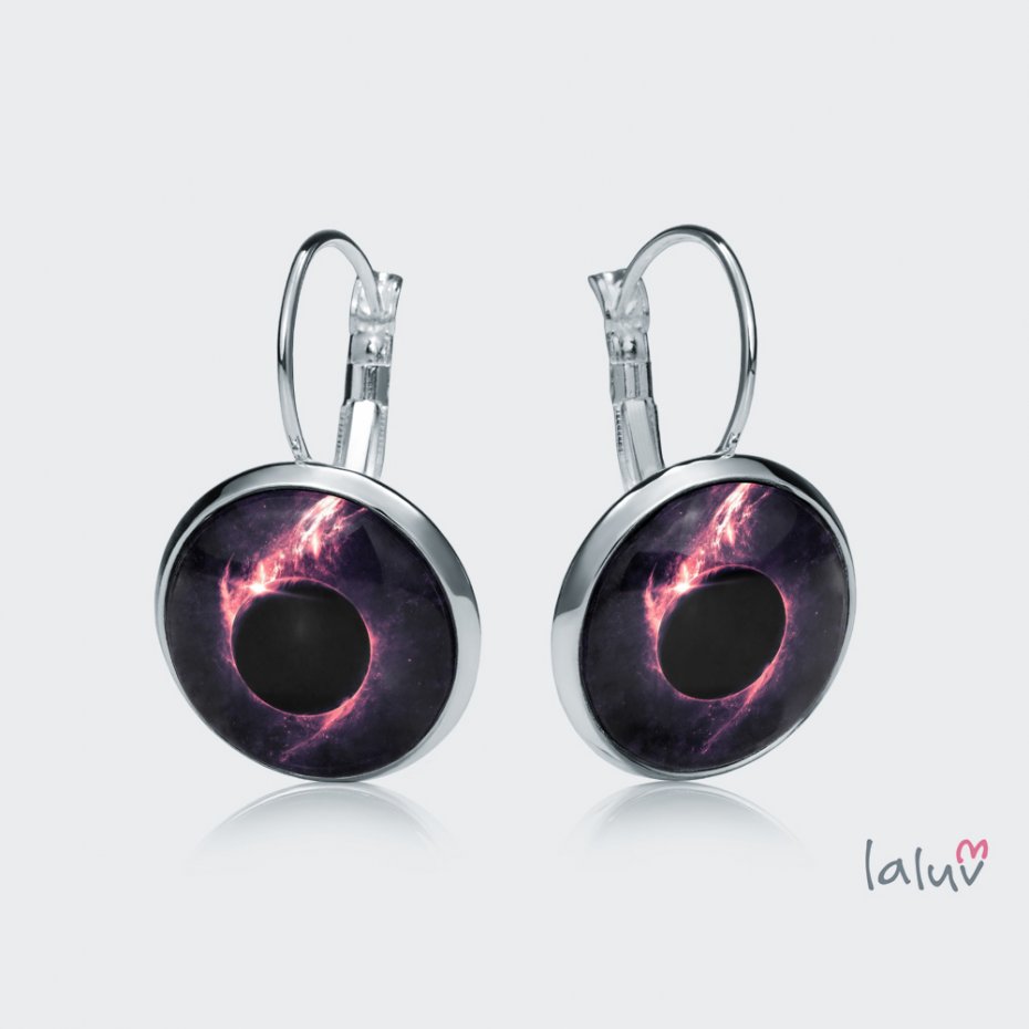 Ręcznie robione kolczyki z wysokiej jakości grafiką zamkniętą pod wypukłym szkiełkiem i oprawioną w antyalergiczną bazę w kolorze srebrnym.