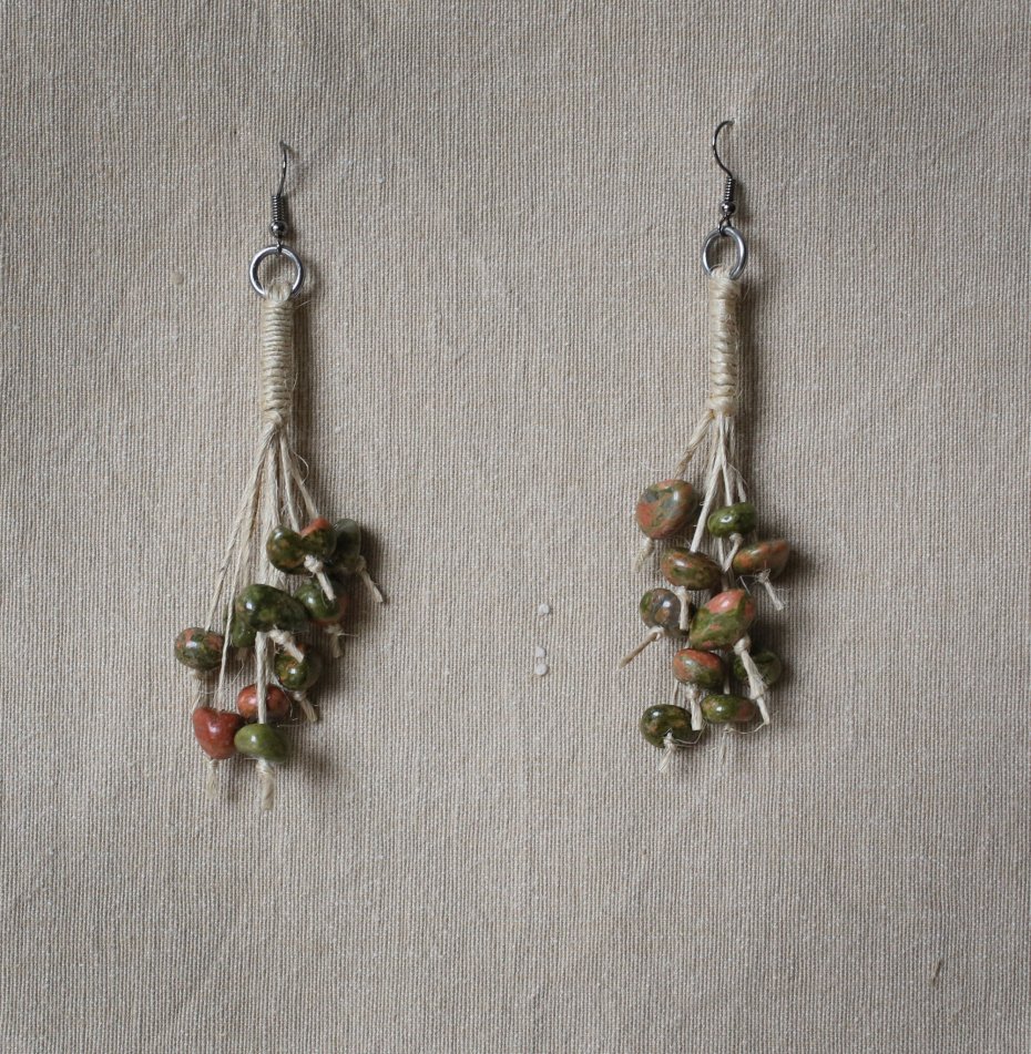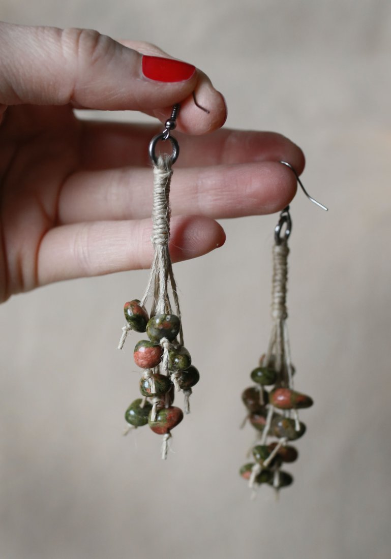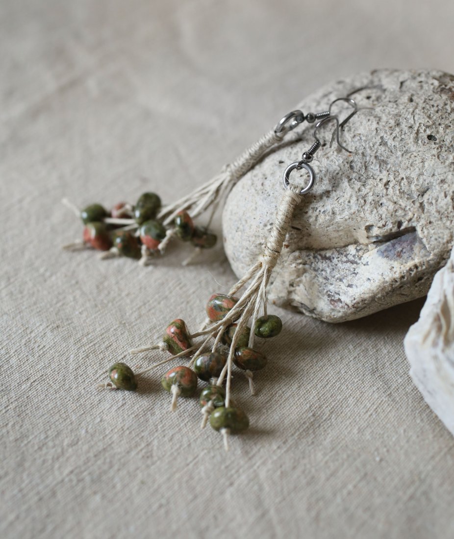 Kolczyki wiszące, w stylu boho, wykonane z lnianych sznurków i kamieni - unakit będący odmianą jaspisu. Bigle ze stali w kolorze antracytowym.