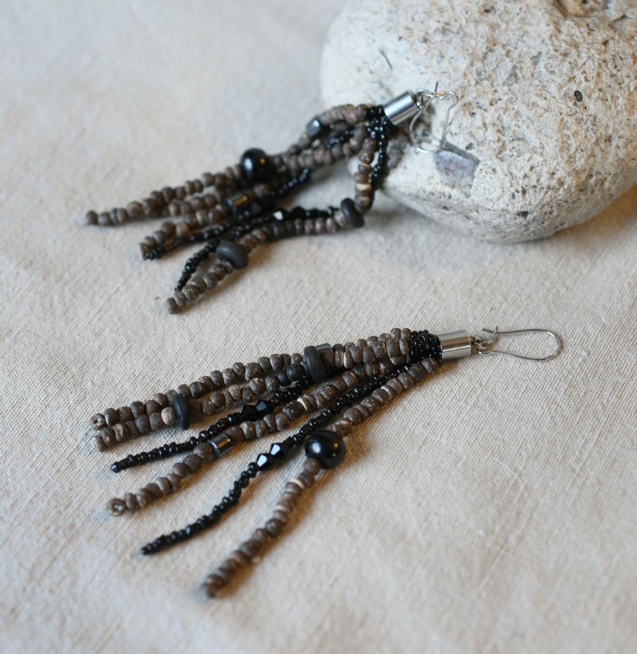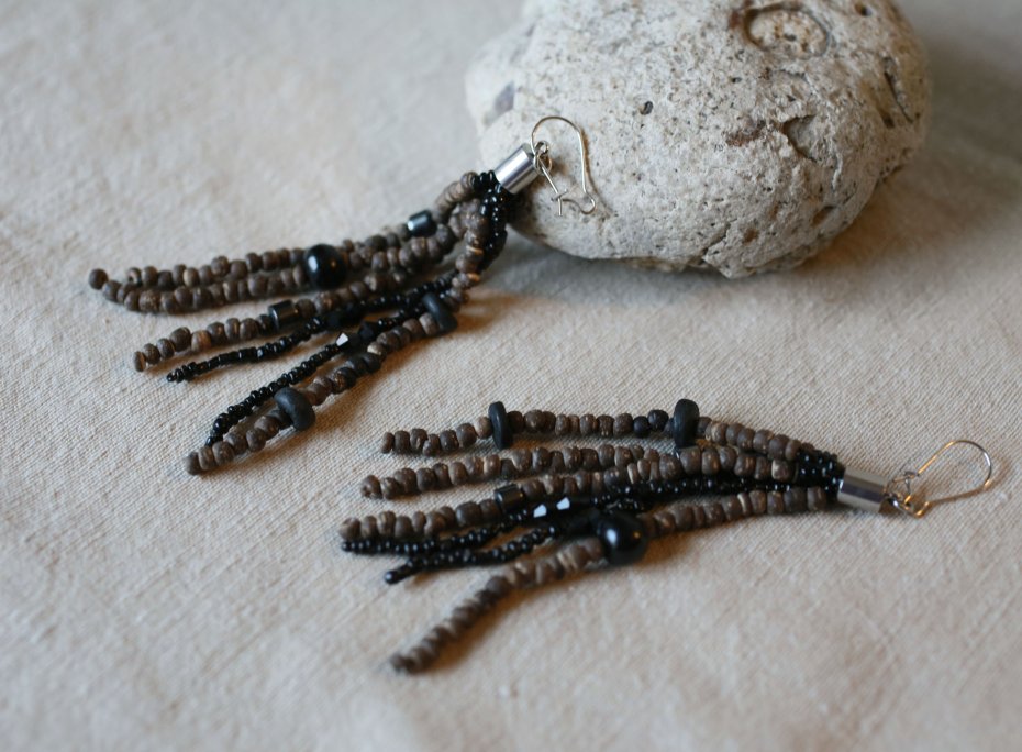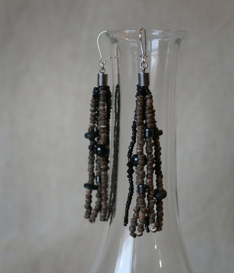 Kolczyki wiszące, w stylu boho, wykonane z drewnianych koralików w tonacji brązowo-czarnej. Bigle ze stali szlachetnej, nieuczulające