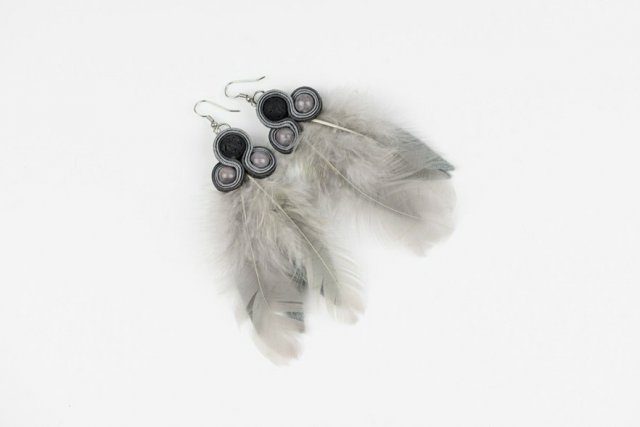 Kolczyki wykonane techniką soutache, przyozdobione naturalnymi, niezwykle efektownymi piórkami, podszyte miękkim filcem