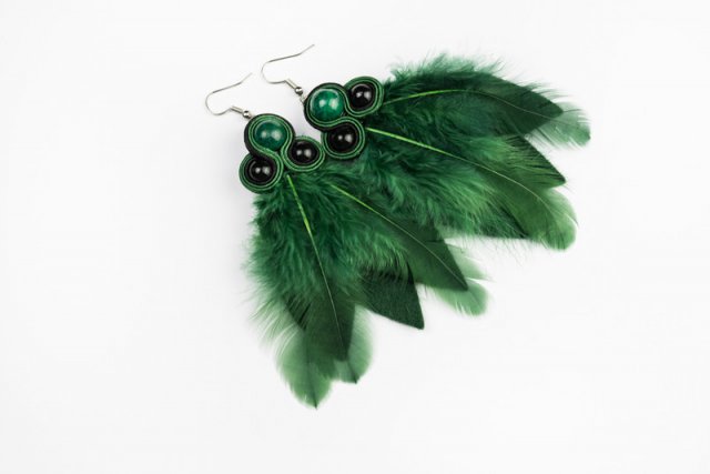5.  > Kolczyki wiszące długie piórka z piórkami pióra zielone butelkowa zieleń sutasz soutache boho hippie (nr 5933381)