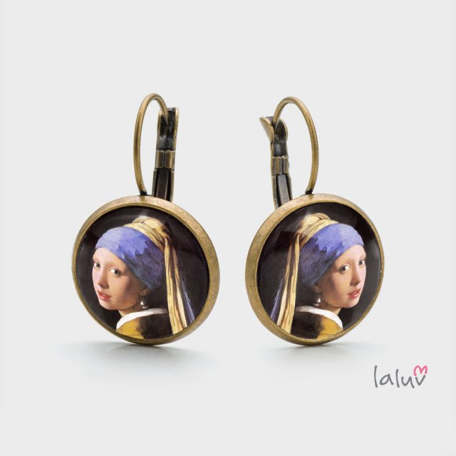 Ręcznie robione kolczyki z wysokiej jakości grafiką zamkniętą pod wypukłym szkiełkiem i oprawioną w antyalergiczną bazę w kolorze starego złota.