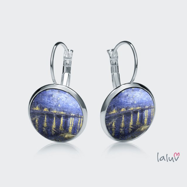 Ręcznie robione kolczyki z wysokiej jakości grafiką zamkniętą pod wypukłym szkiełkiem i oprawioną w antyalergiczną bazę w kolorze srebrnym.