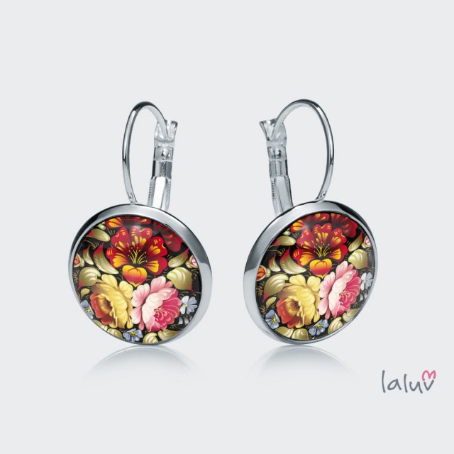 Ręcznie robione kolczyki z wysokiej jakości grafiką zamkniętą pod wypukłym szkiełkiem i oprawioną w antyalergiczną bazę w kolorze srebrnym.