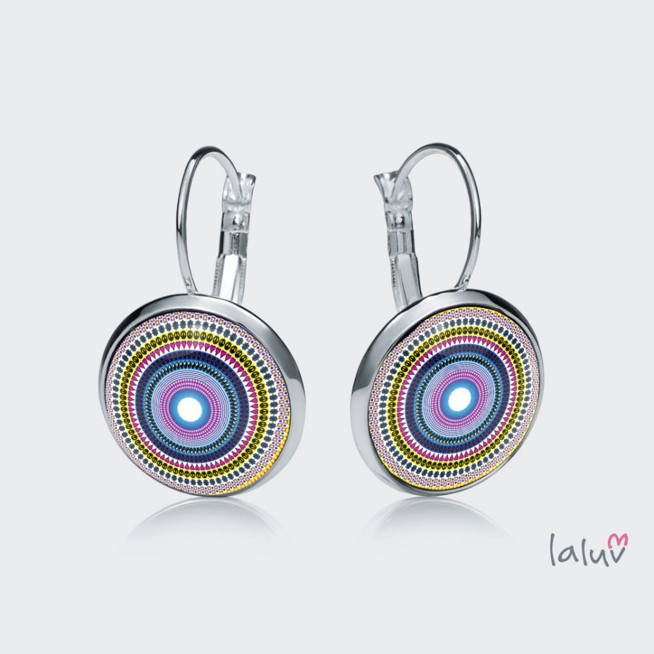 Ręcznie robione kolczyki z wysokiej jakości grafiką zamkniętą pod wypukłym szkiełkiem i oprawioną w antyalergiczną bazę w kolorze srebrnym.