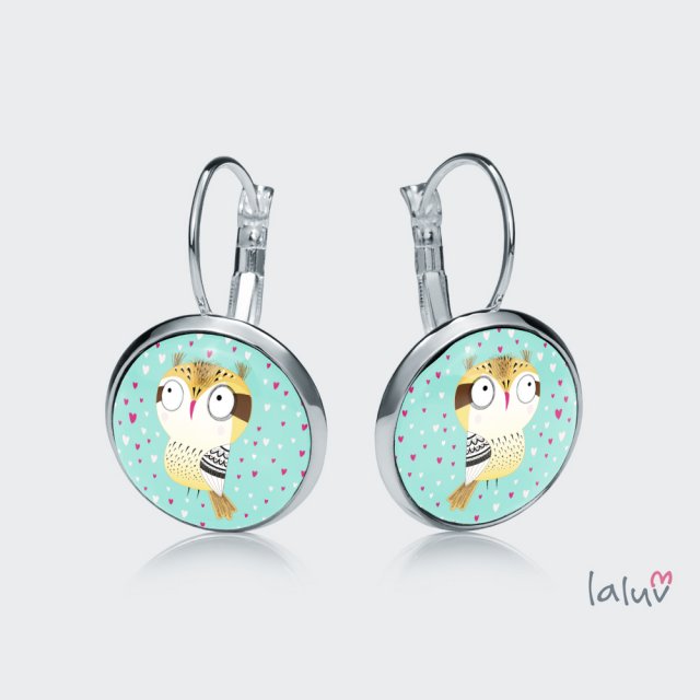 Ręcznie robione kolczyki z wysokiej jakości grafiką zamkniętą pod wypukłym szkiełkiem i oprawioną w antyalergiczną bazę w kolorze srebrnym.