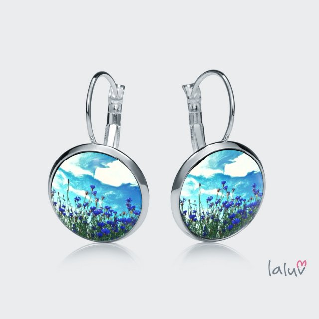 Ręcznie robione kolczyki z wysokiej jakości grafiką zamkniętą pod wypukłym szkiełkiem i oprawioną w antyalergiczną bazę w kolorze srebrnym.