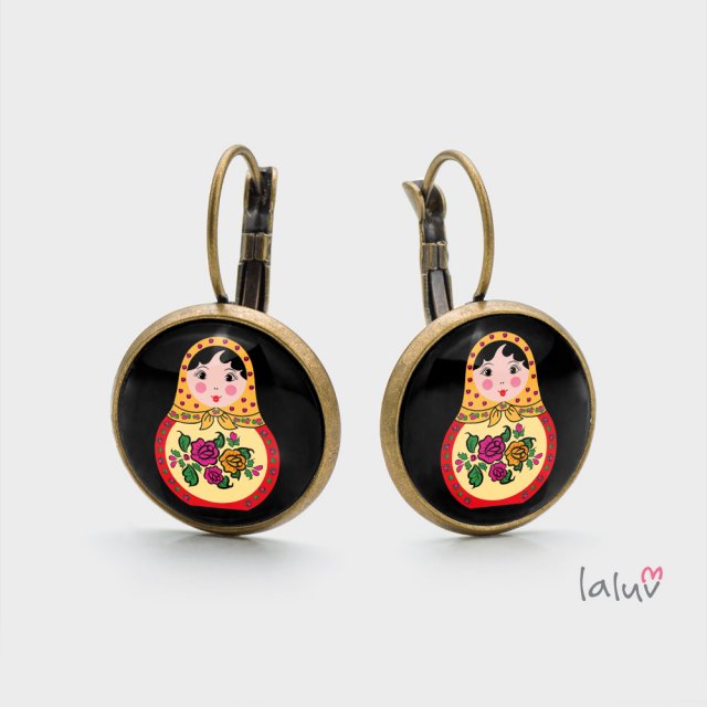 Ręcznie robione kolczyki z wysokiej jakości grafiką zamkniętą pod wypukłym szkiełkiem i oprawioną w antyalergiczną bazę w kolorze starego złota.